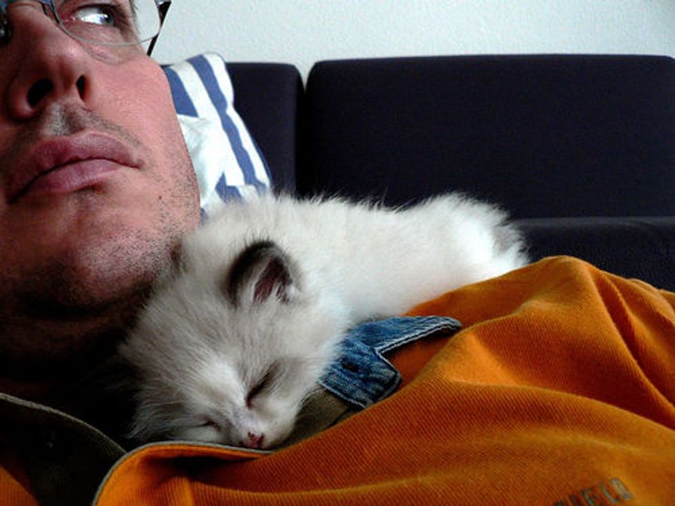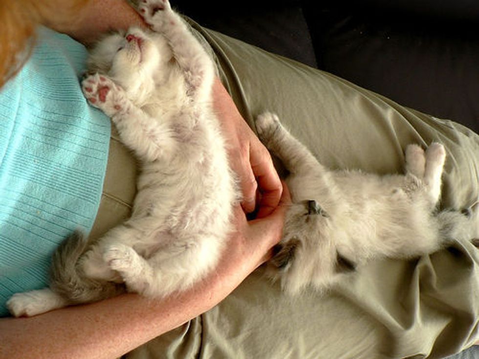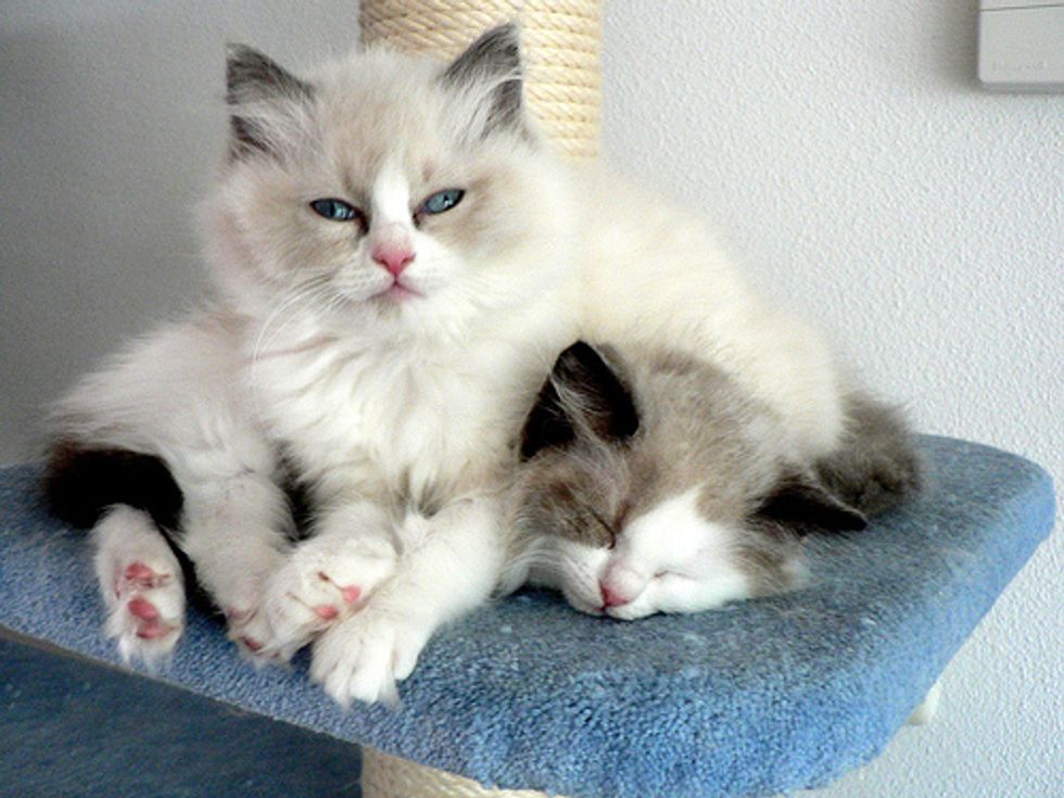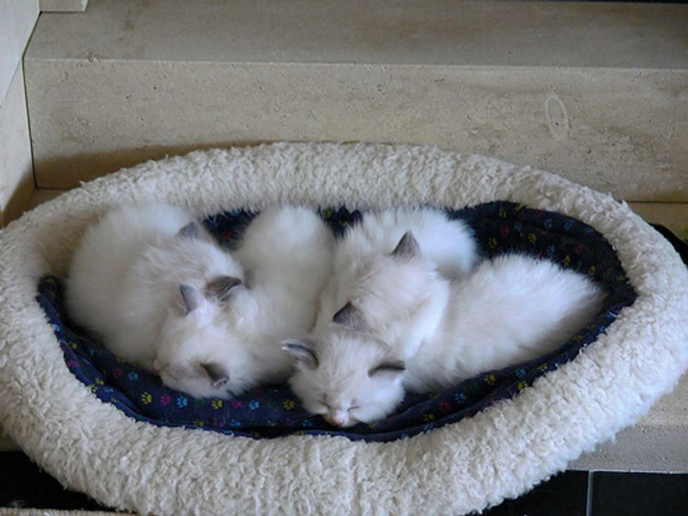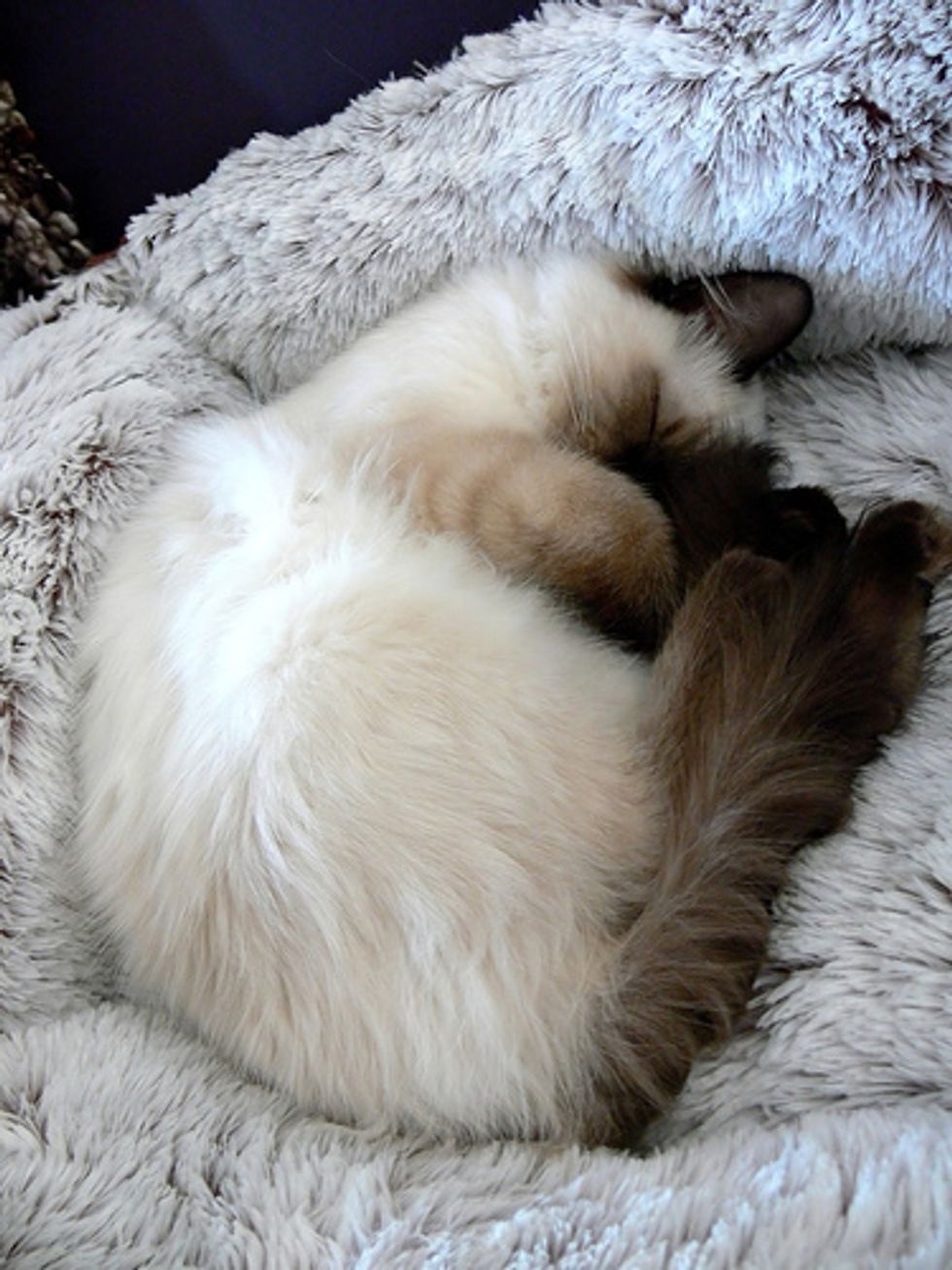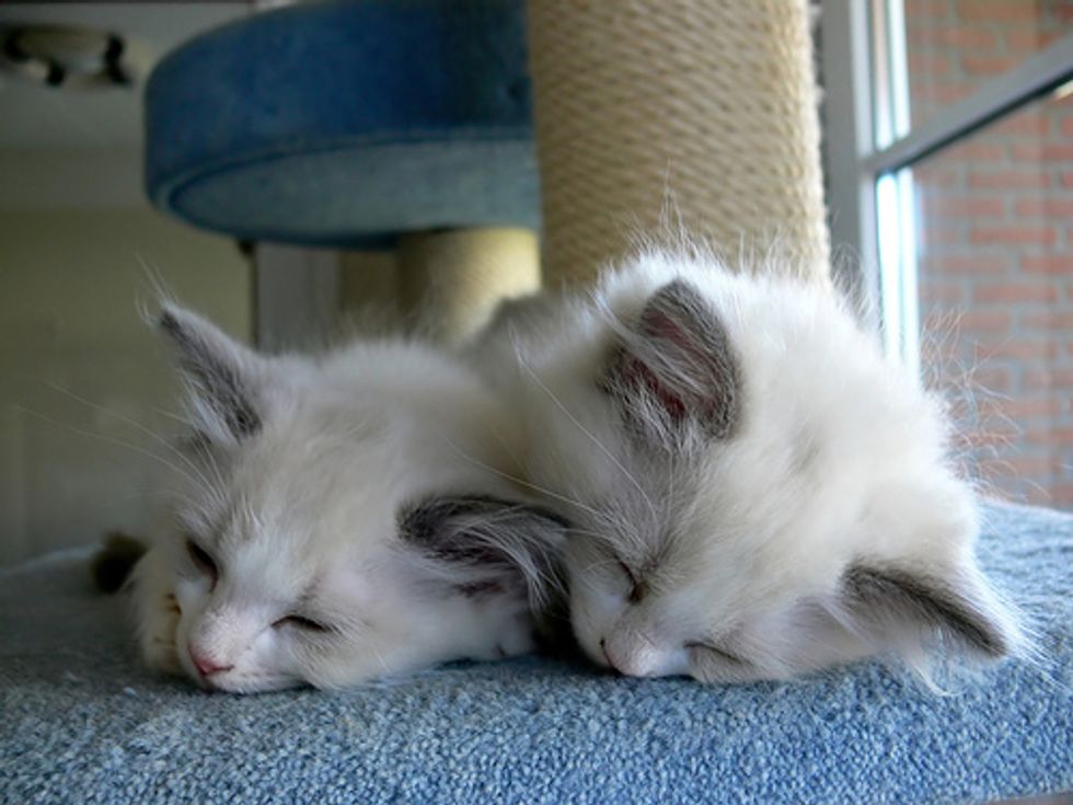 These fluffy delights can sleep almost anywhere. They like to cuddle with their litter mates, rest on their owners' body, use another kitty as their pillow or just sleep on any soft, comfy spot. You can visit Tom's website to meet all the Ragdoll kitties.