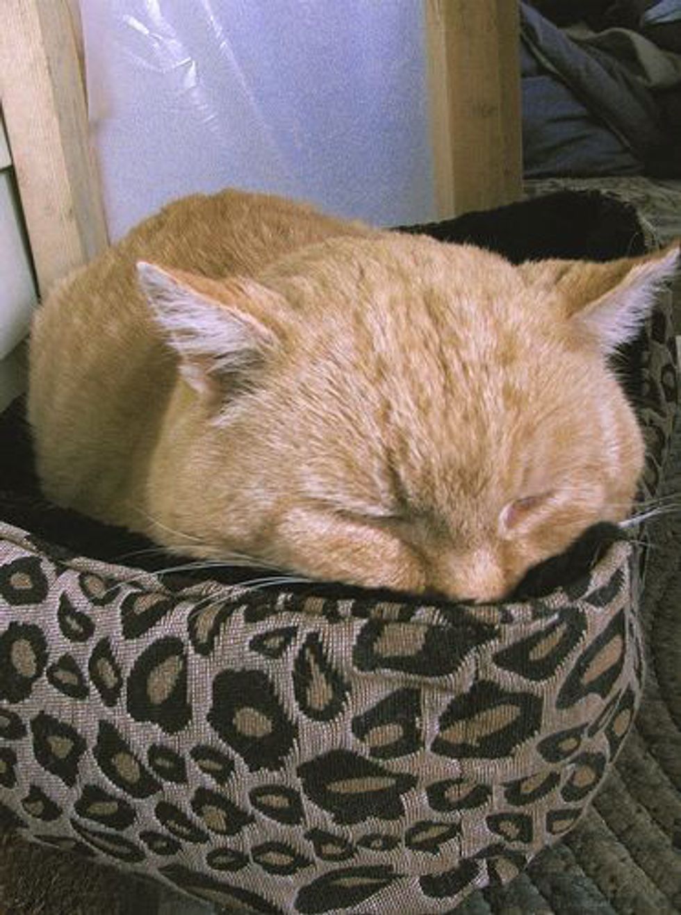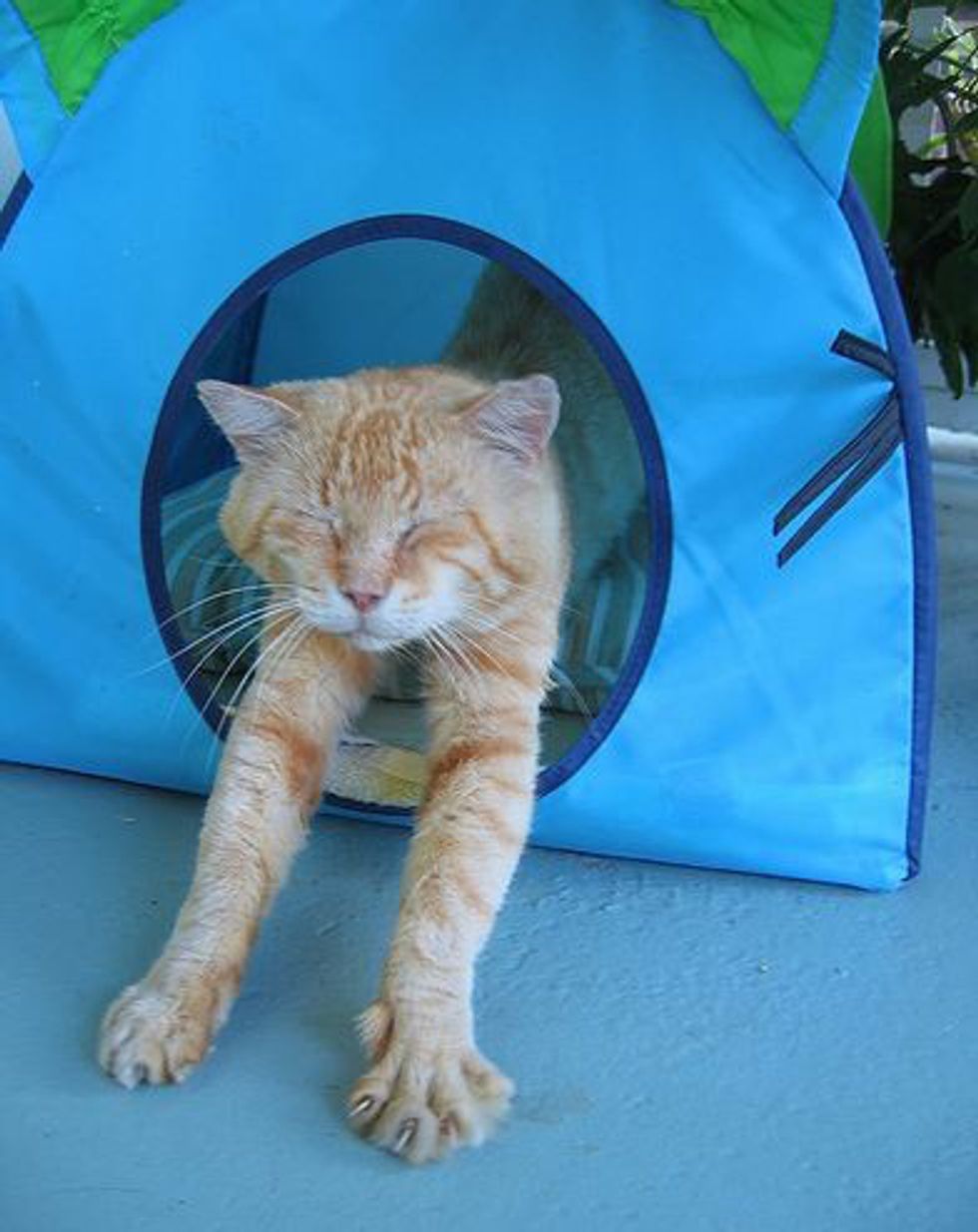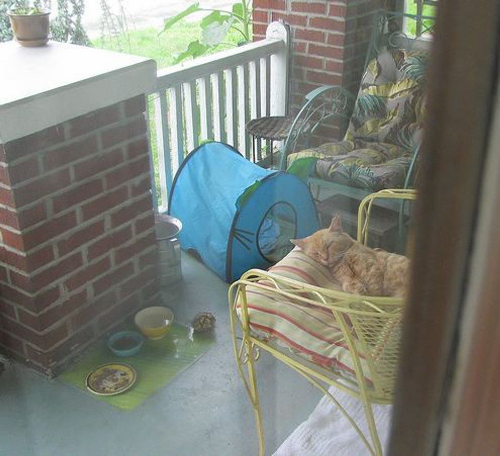 The second & third winters I enclosed half of the porch to provide him with a warm, dry shelter over the winter. It works out very well. He loves his "apartment;" it has a cat door. I spend time with him every single day, at least twice a day, sometimes napping with him on his favorite cot in the "apartment." He jumps up there with me and plops down on my head, purring like a giant lawnmower. He rubs his big fat cheeks on my face and makes little sounds to show his appreciation and affection for me. To me that makes it all worthwhile.