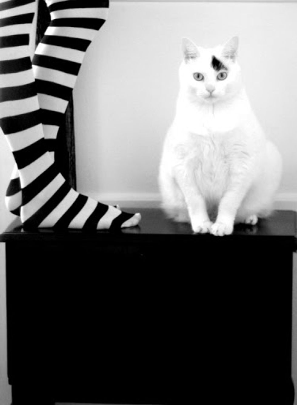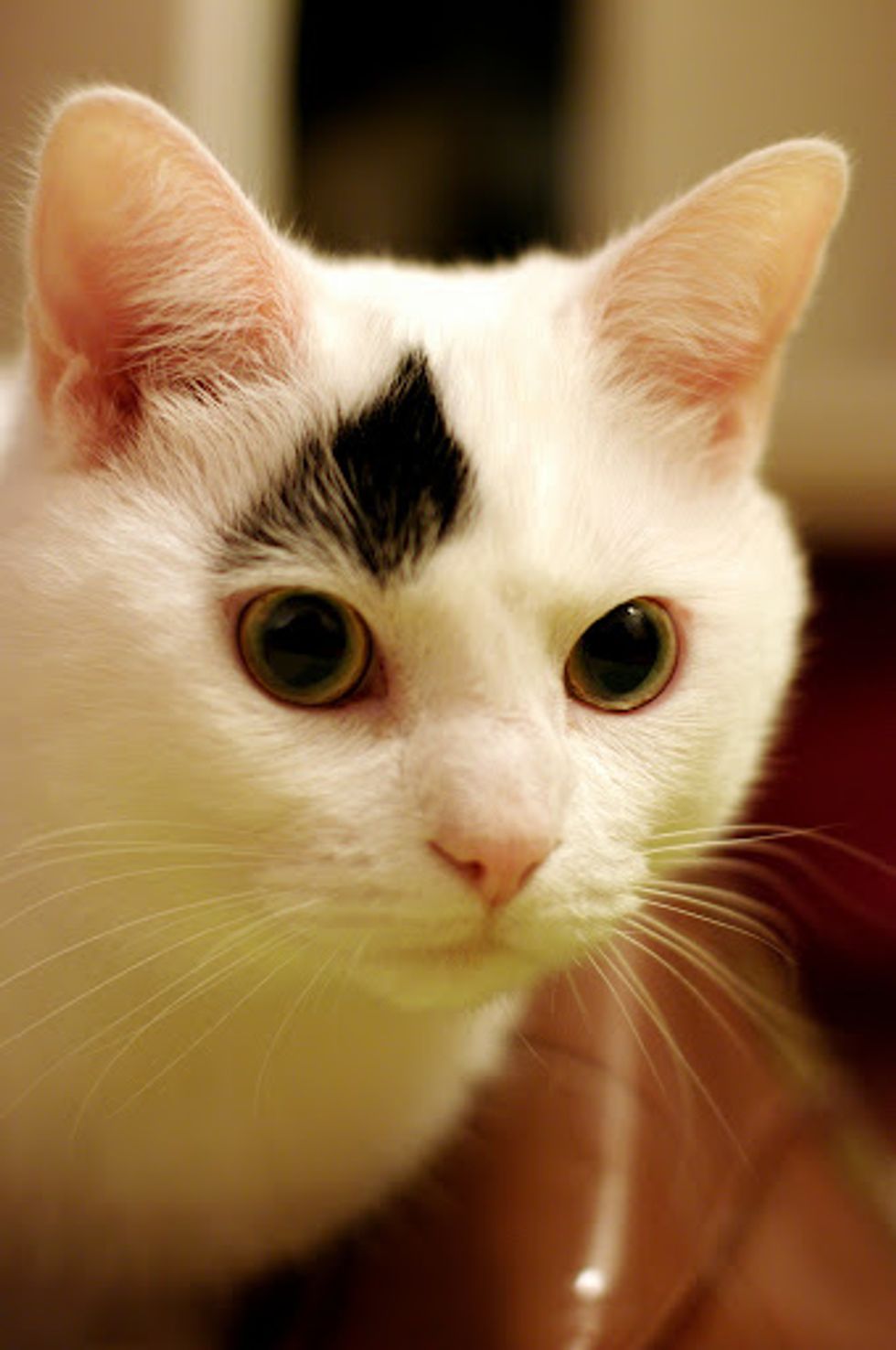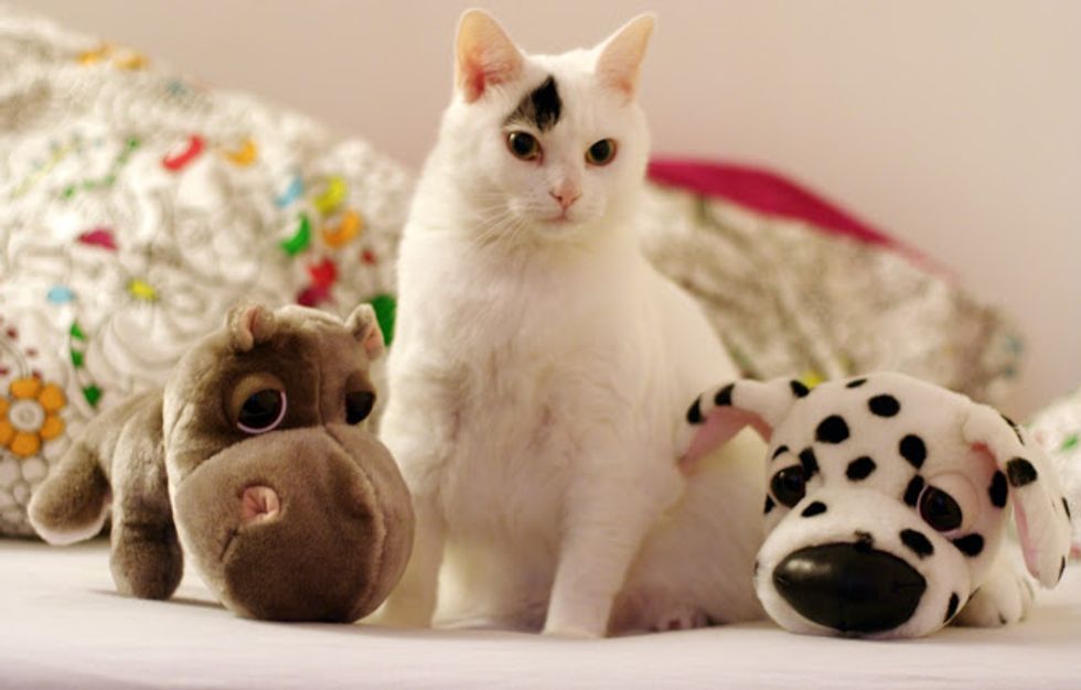 Mimo, an almost white cat with a black spot on his forehead is now 2 years old. When he was a little kitten, he was found abandoned in a garden in France. OoPsy learned about Mimo through a friend who rescued him and decided to bring the little one home with her. Mimo's black smudge has become his signature and makes him a real eye-candy.