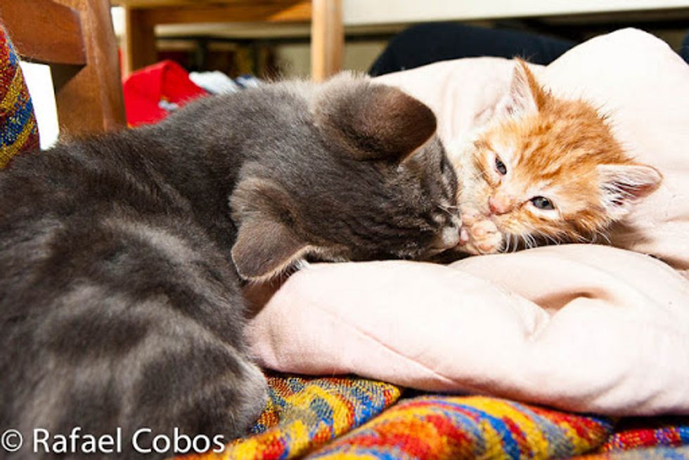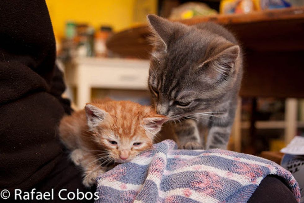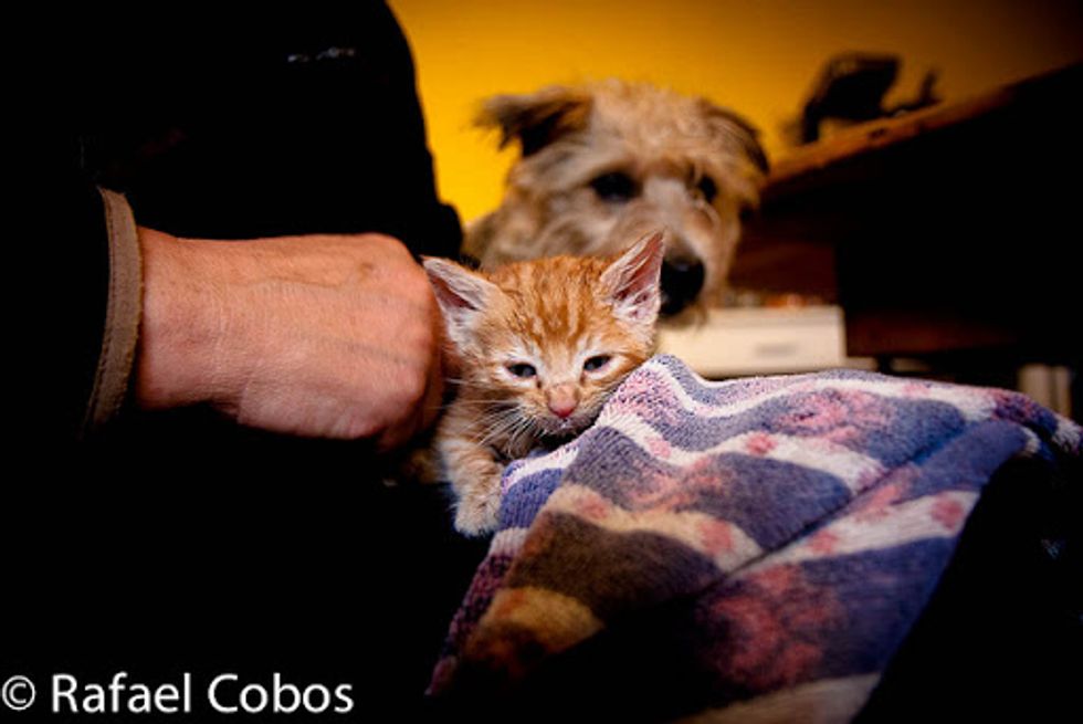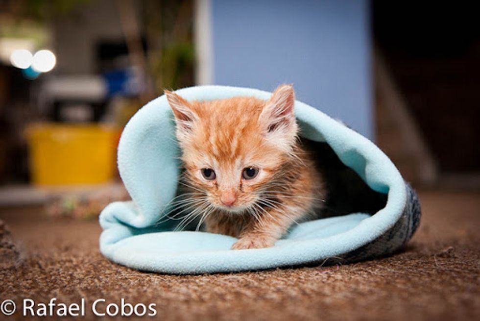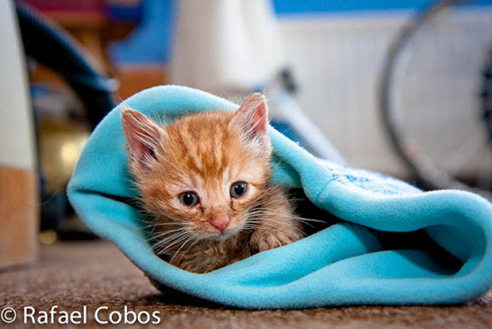 This ginger baby was rescue recently by Rafael Cobos's neighbor at a farm. She was one of the feral kittens that survived in her litter. "Our next door neighbour found her hiding, soaking wet from the rain and suffering mild hypothermia," said Rafael.