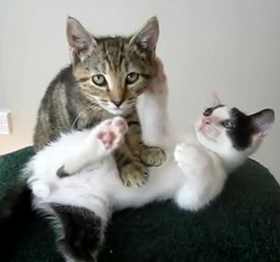 Chloe the tabby is giving her best fur friend Bugsy massage therapy. How adorable is that! Foster Kittens Chloe and Bugsy are from the Vancouver Orphan Kitten Rescue Association (VOKRA). "To see them here, it is hard to believe how timid, wild and fearful they were when they were first rescued," said their foster mom, a volunteer from VOKRA.