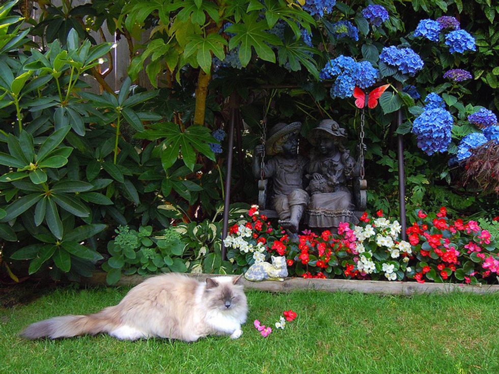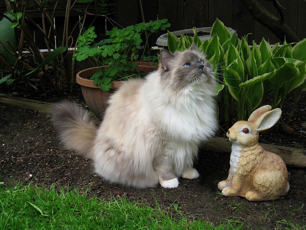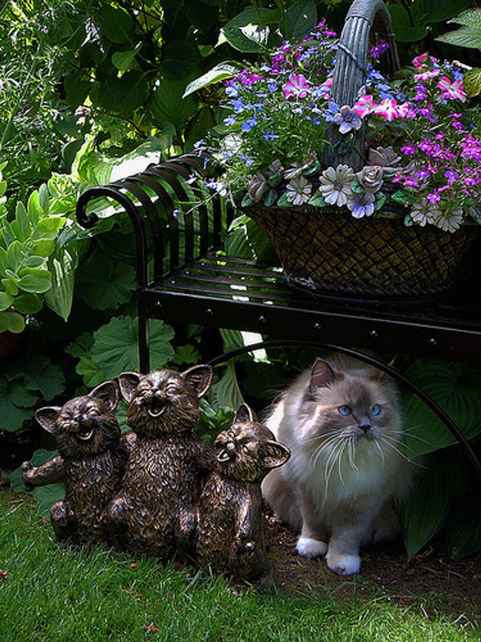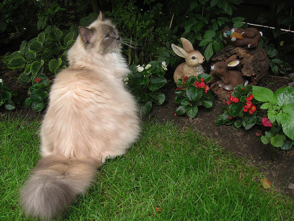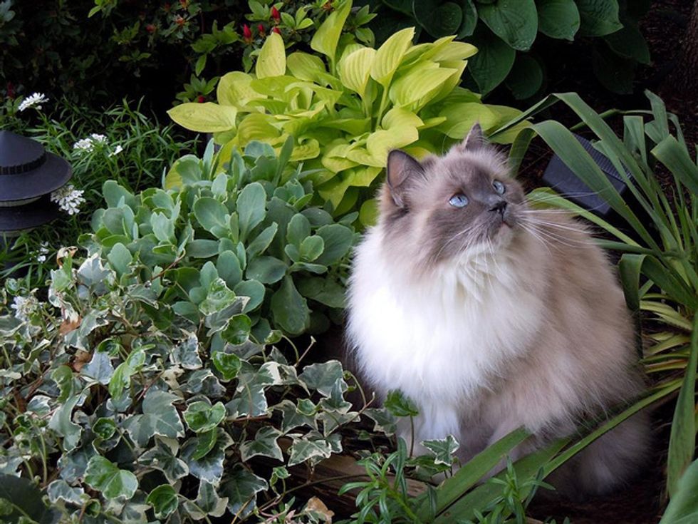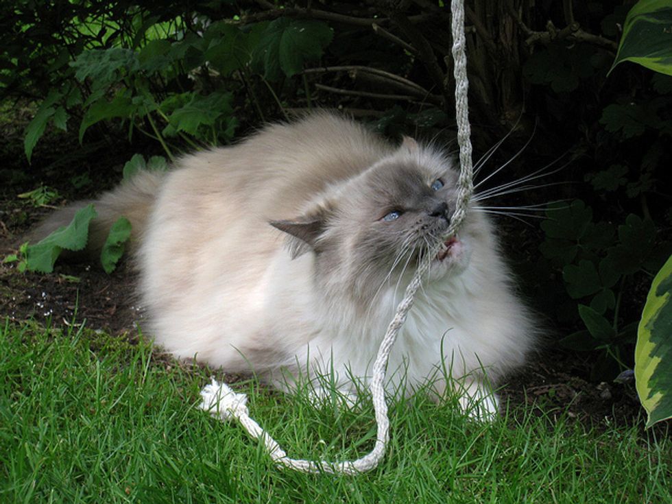Lacey is now in her sixth year, and has given us so much joy and happy times over the years. She loves to play in the backyard with me. There are lots to interest her there, like squirrels coming by, birds of course in the trees, and bugs. She loves to jump up at any flying bug. She'll chase anything, a long plant stem, a string, a branch off of a shrub... She goes crazy chasing things and will jump high into the air at times after them. She'll catch the string or rope I sometimes use for her to chase, and when she catches it, she runs away, dragging it behind her. It's so funny.