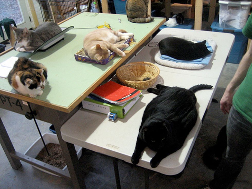 All the rescues can roam freely all day except for the sick cats who are taking medication and the new arrivals who are temporally caged until they are vetted and ready to transition into the population as a whole.