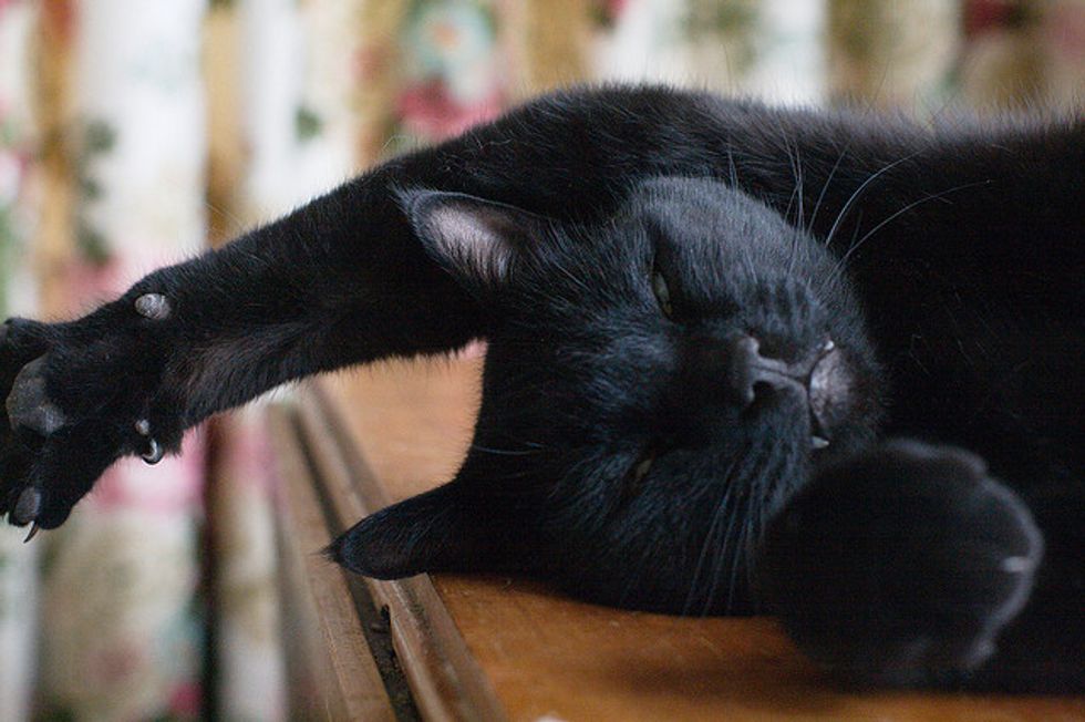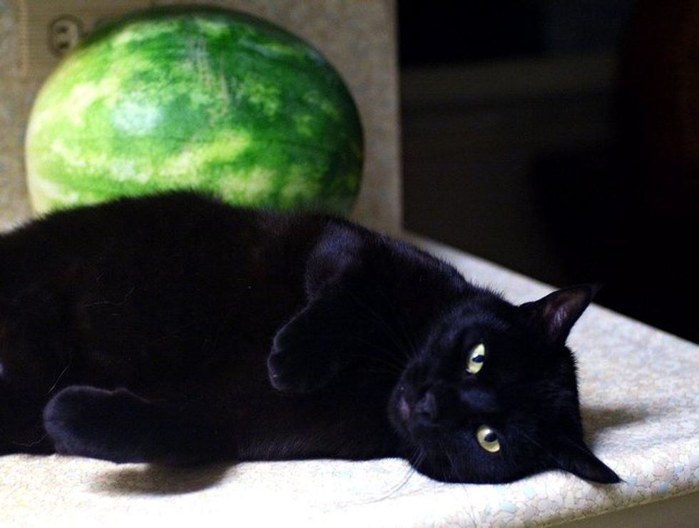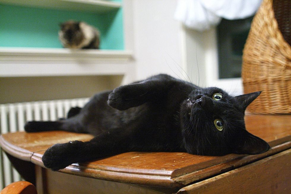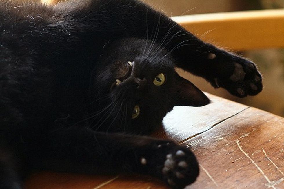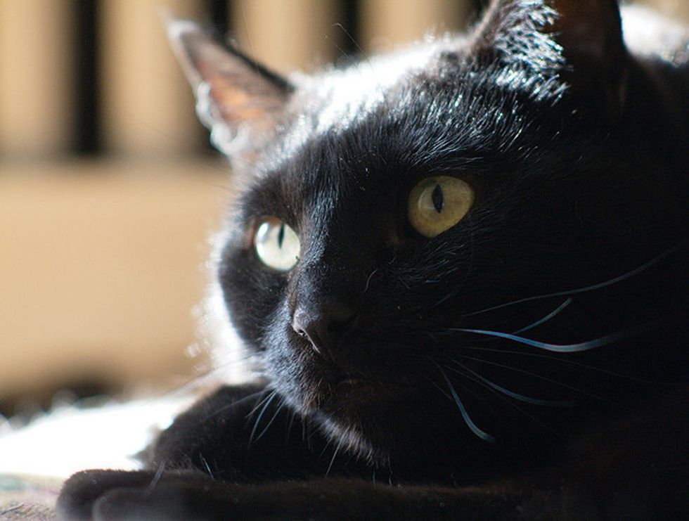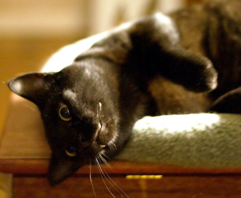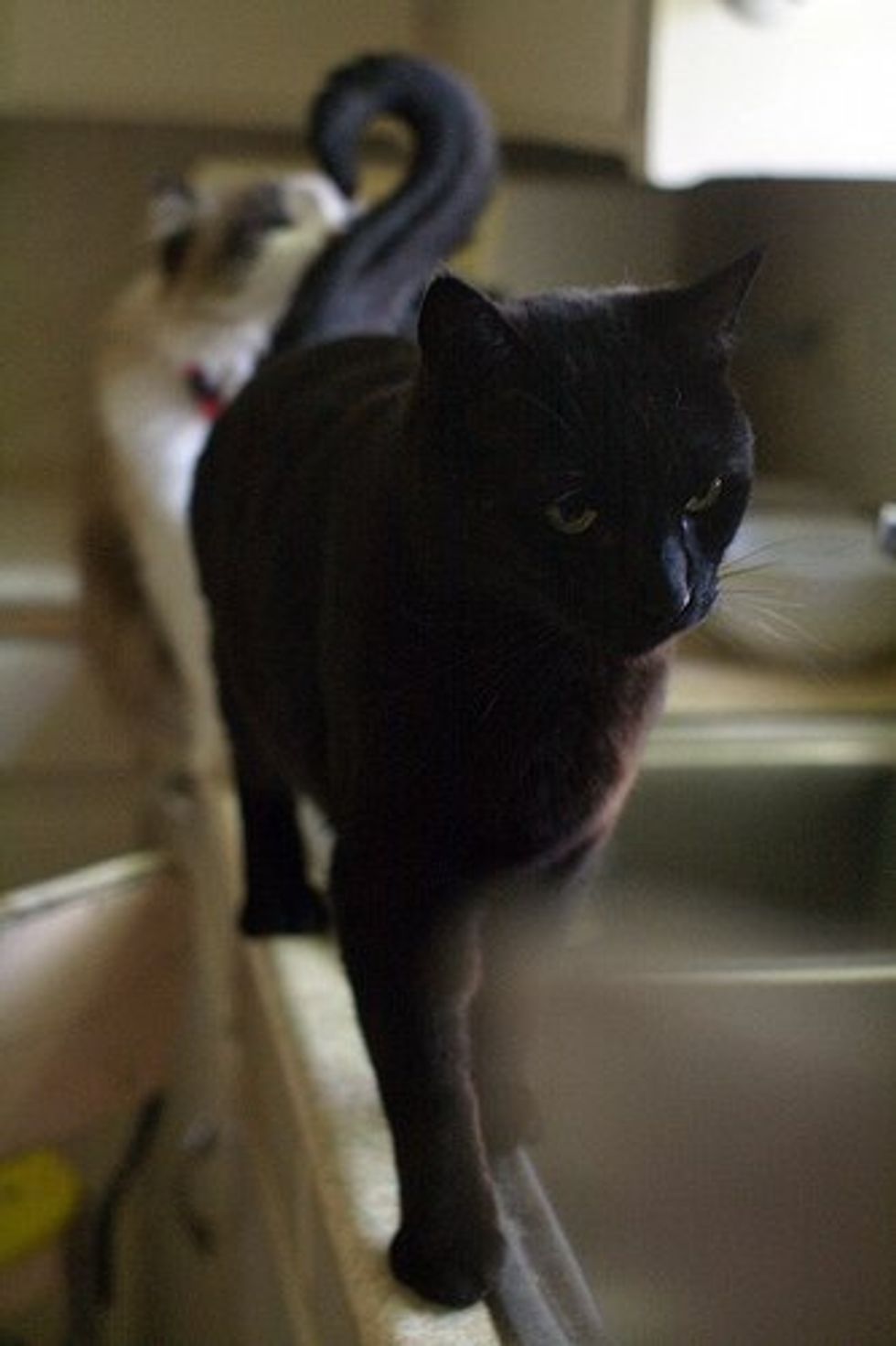"Ulysses" is the name I gave my black rescue because of the trials he had been through, separated from his home and family by having, probably, been thrown away at the side of the freeway and having to keep himself alive amid constant dangers of freeway traffic, extreme weather, no food or water, and predators, such as dogs, coyotes, and hawks. (The legendary hero, Ulysses, faced 20 years of trials and attacks and danger trying to get back home to Ithaca from the Trojan War. I figured this kitty had been through just about as much.) The veterinarian thought he was about two years old and had likely survived on his own for that long.