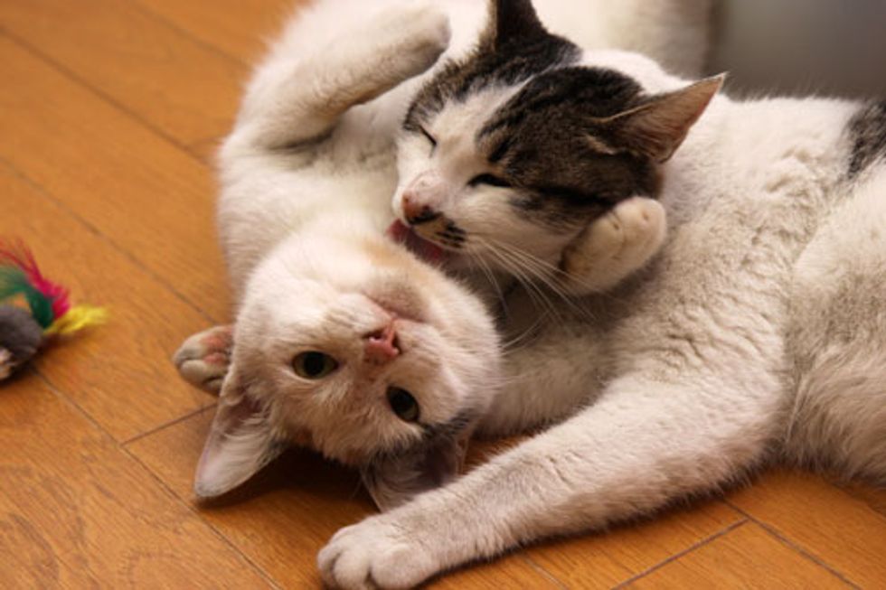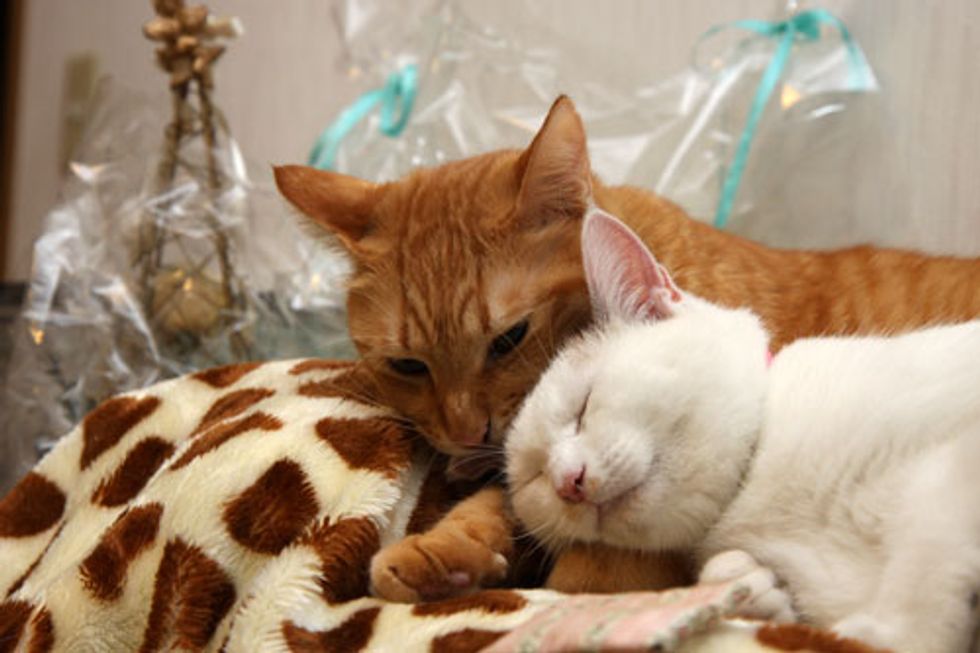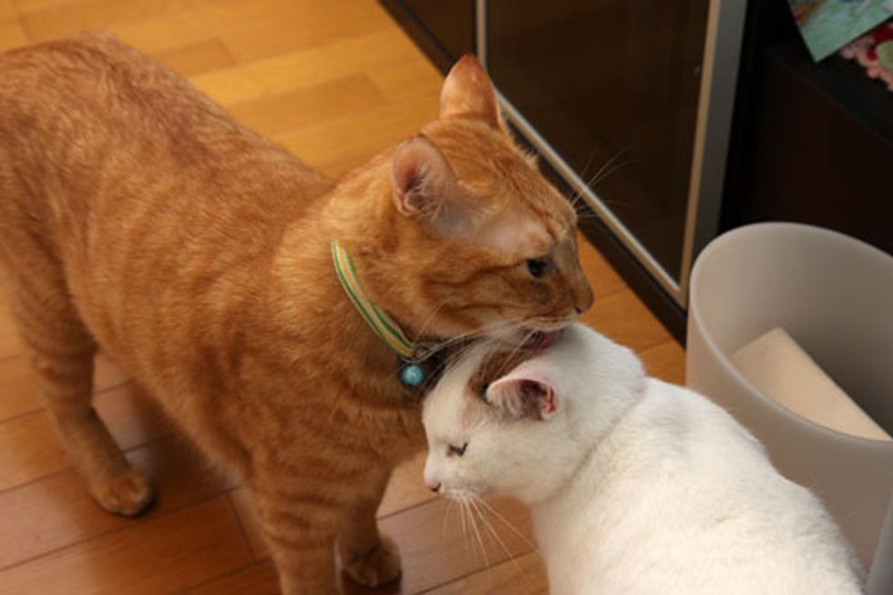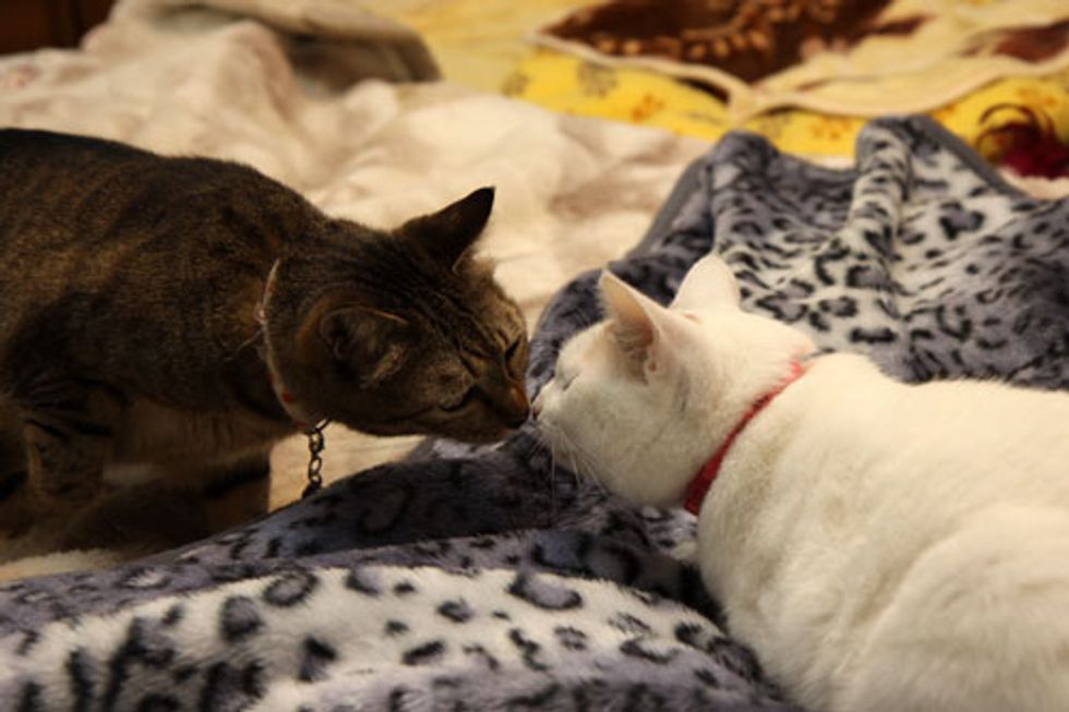 She bonded with a few kitty residents in the house. They welcomed her by washing her forehead and giving her kisses.