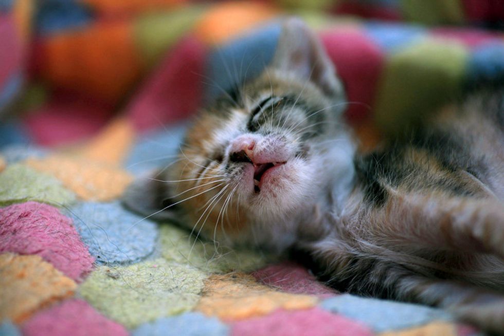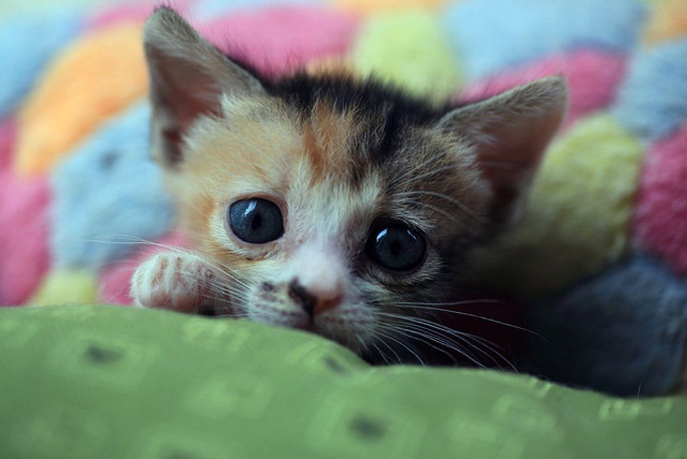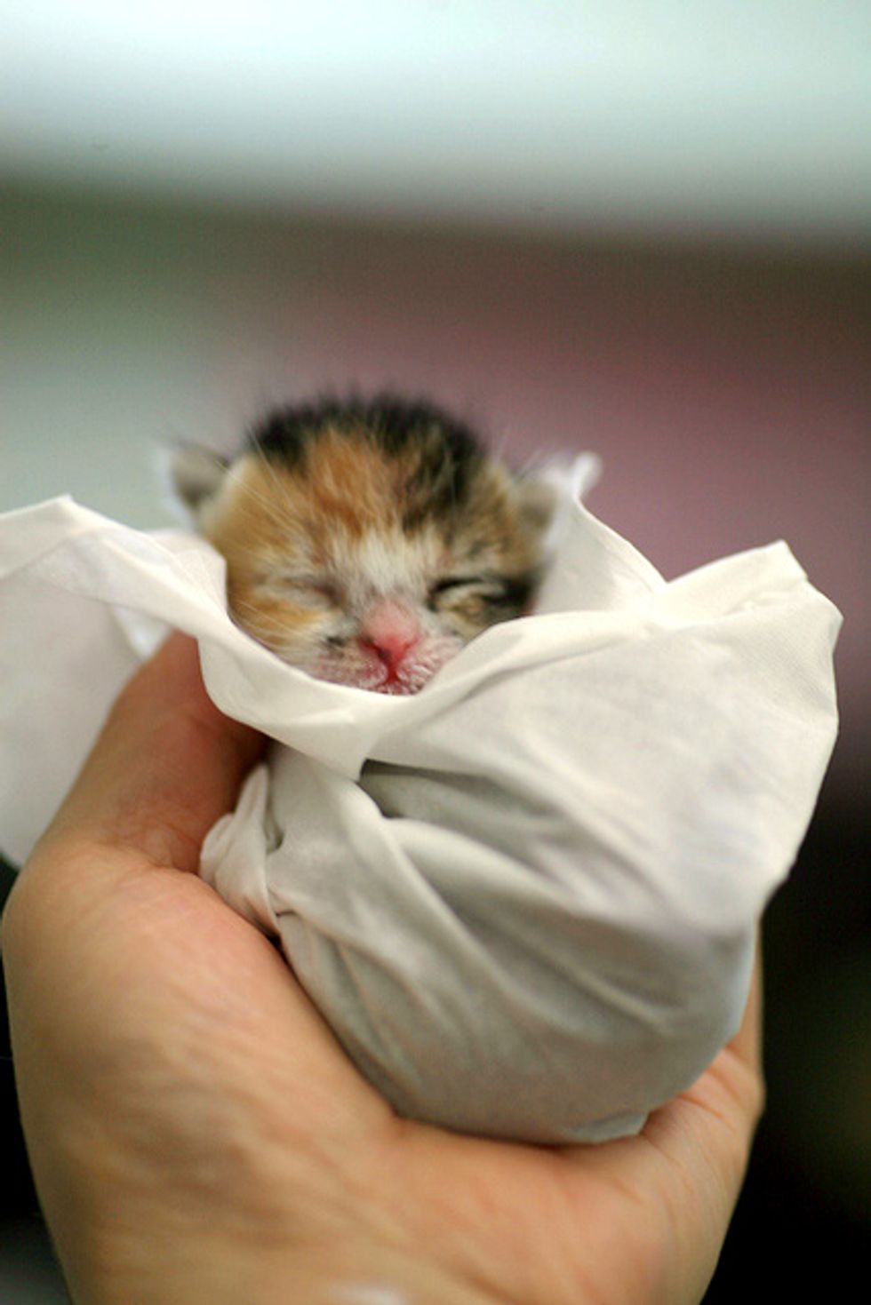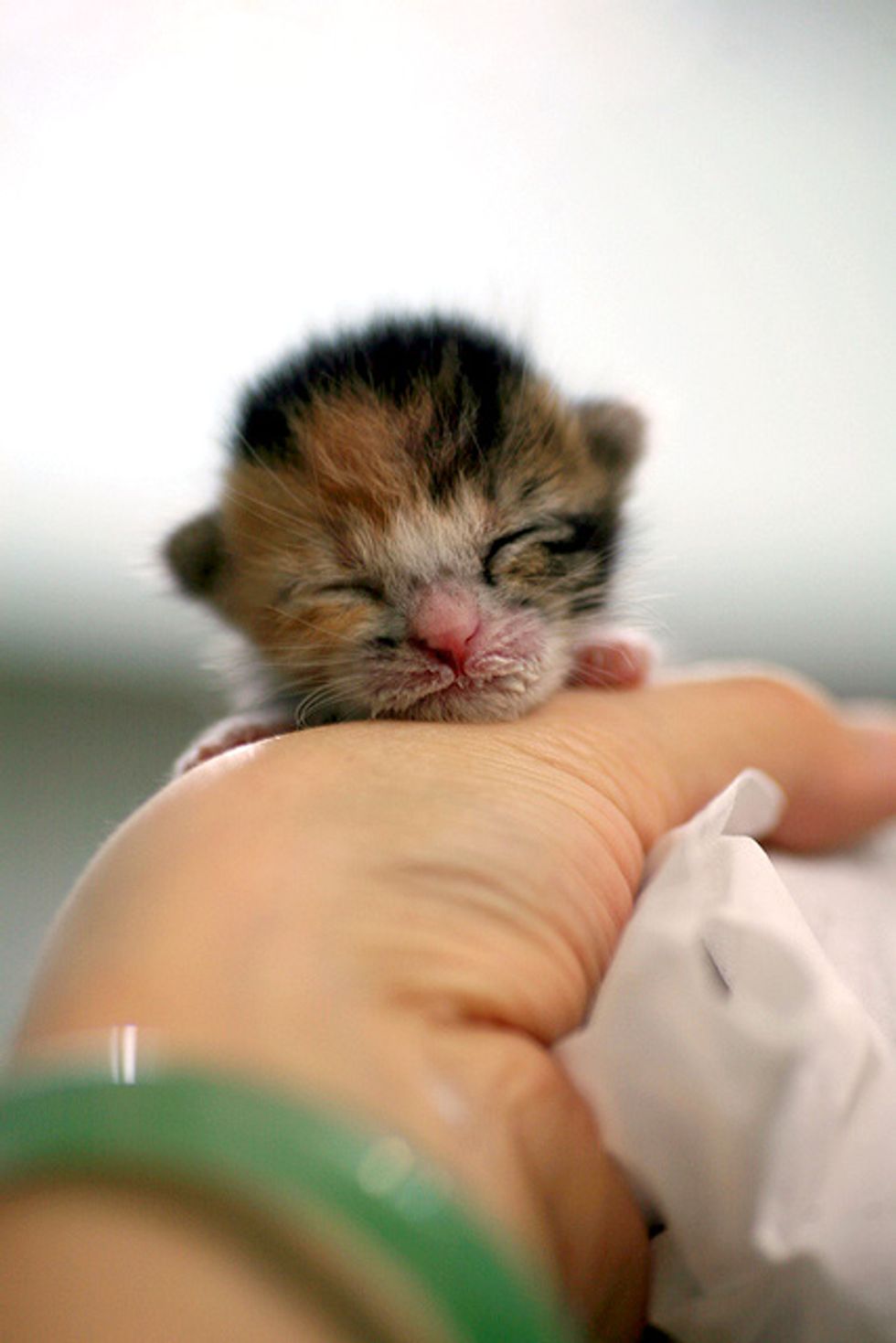 Little Kitten was infested with fleas and was skin and bones. After many sleepless nights, Tracy was able to nurse the calico baby back to health.