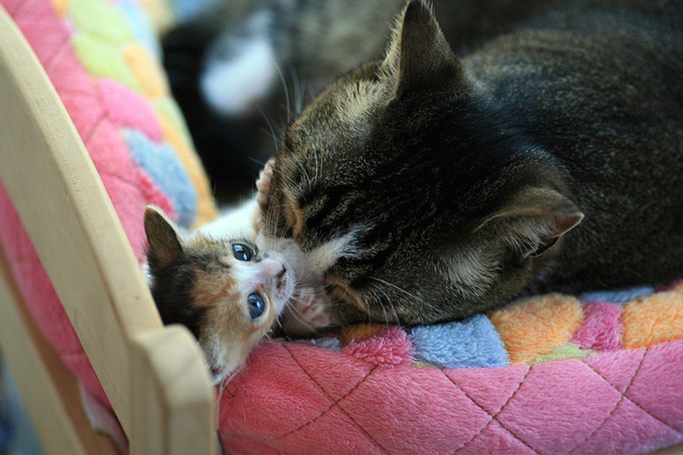 Happy, one of the cat residents really bonded with Little Kitten. She often checked on the little calico and bathed her after every meal.