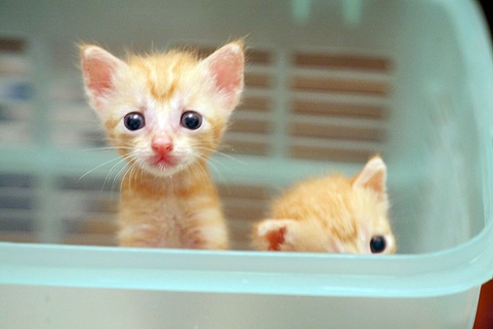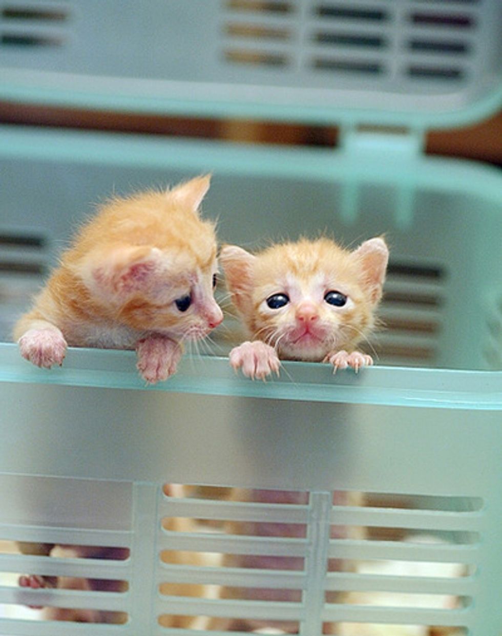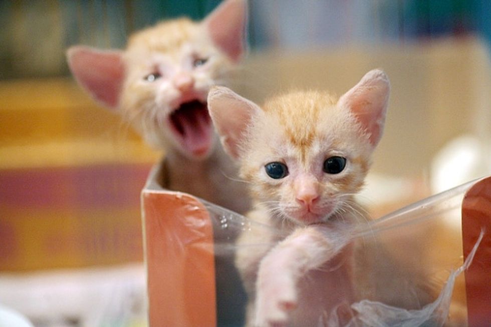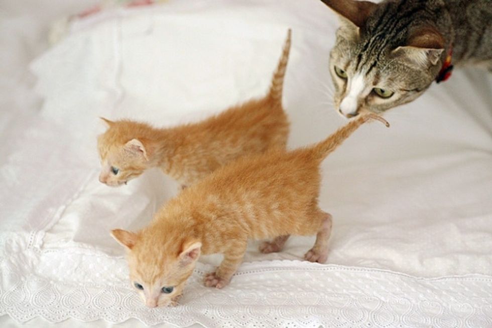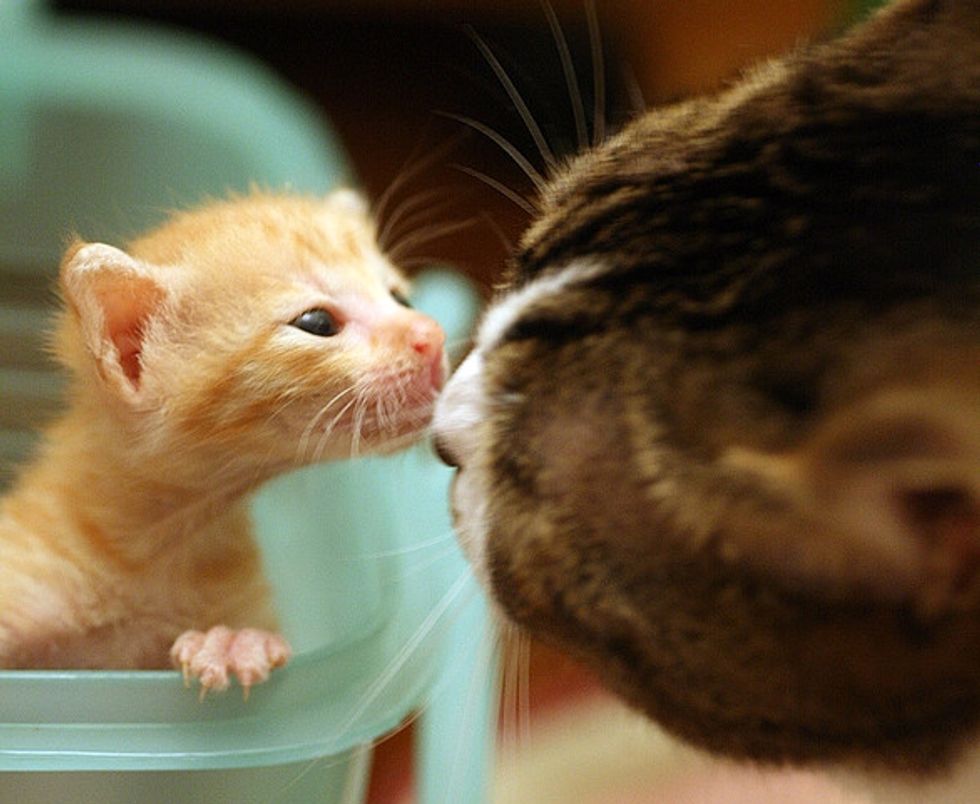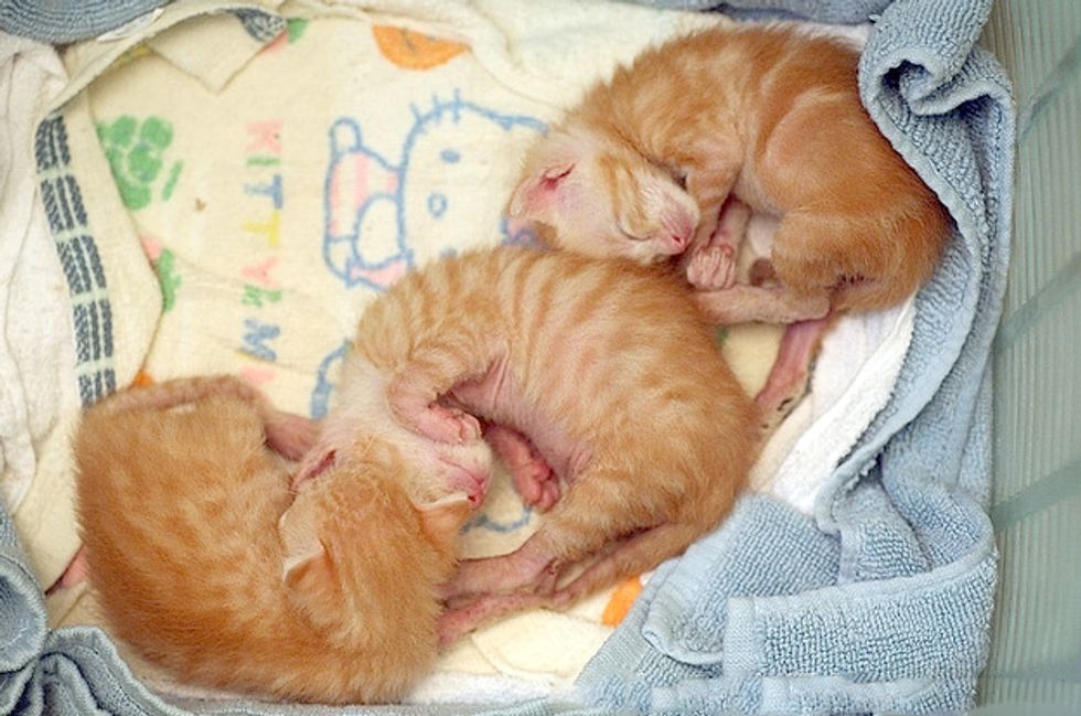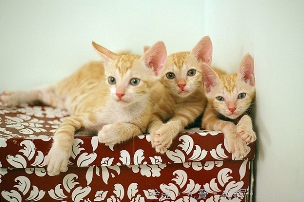 Three beautiful ginger babies were brought to the shelter. Within a few hours, they arrived in their foster home where they were greeted by not just one, but many cat residents who started taking care of them in rotation. The kittens were around 20 days old, still bottle babies.