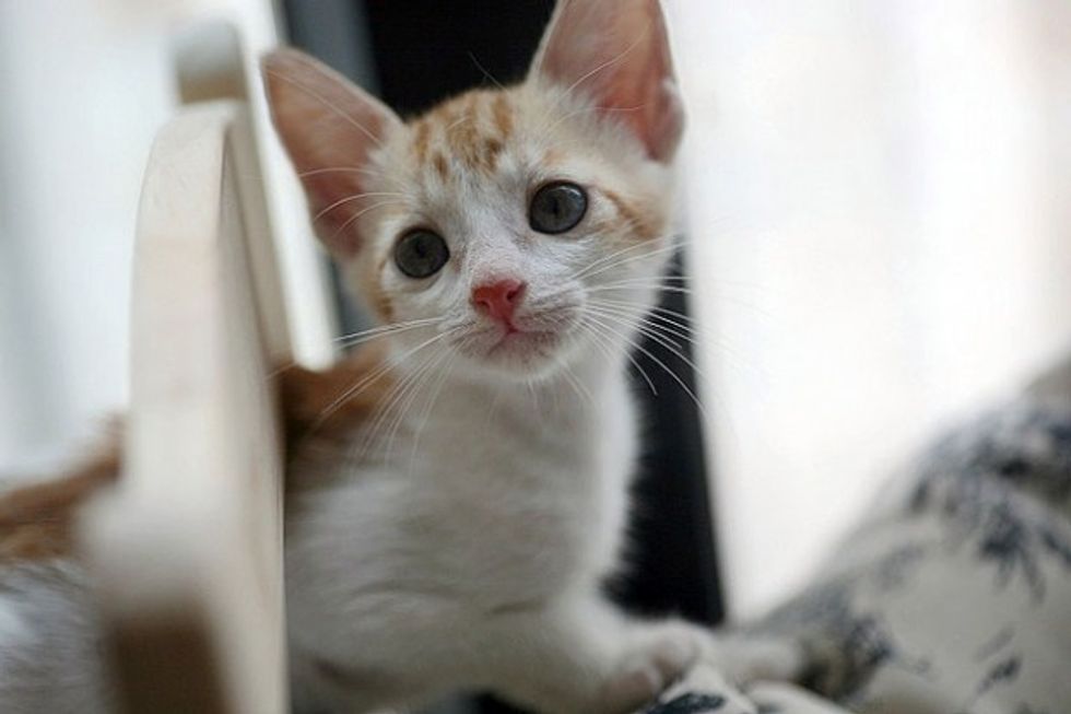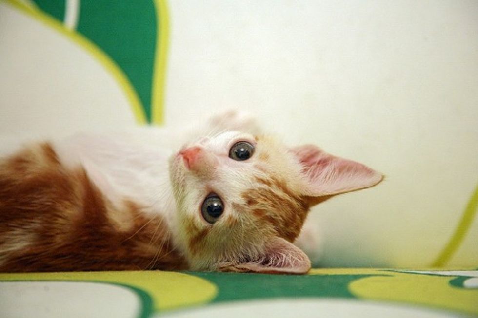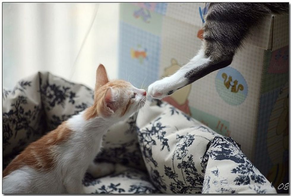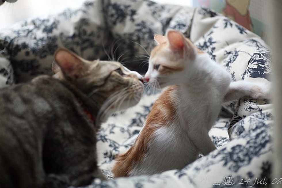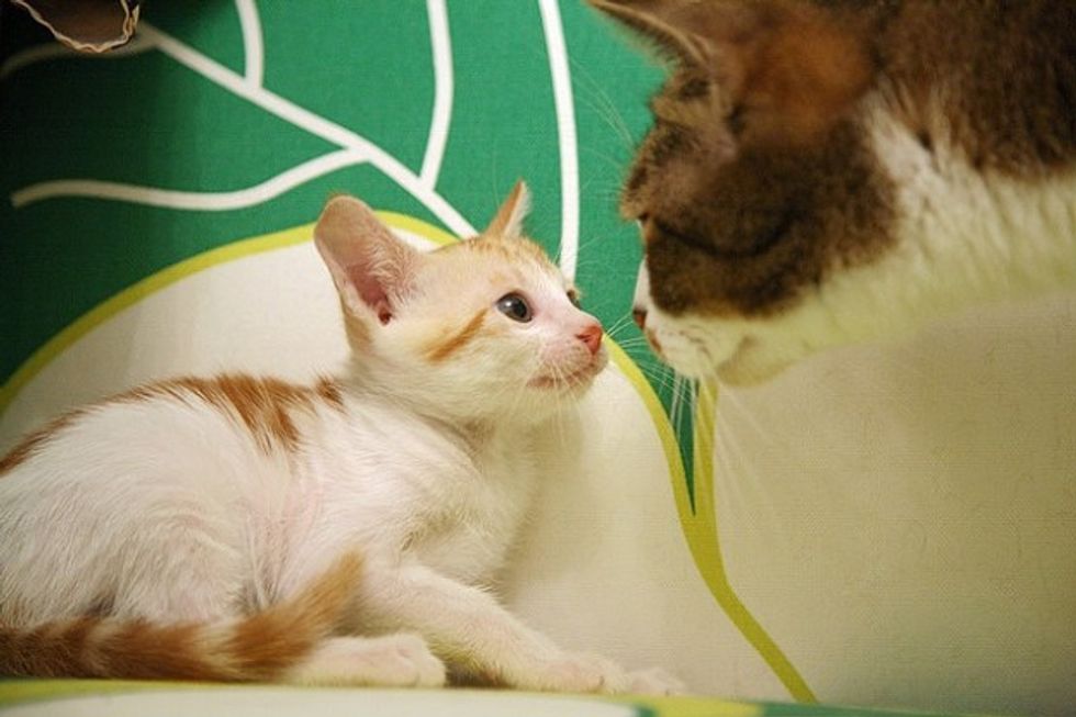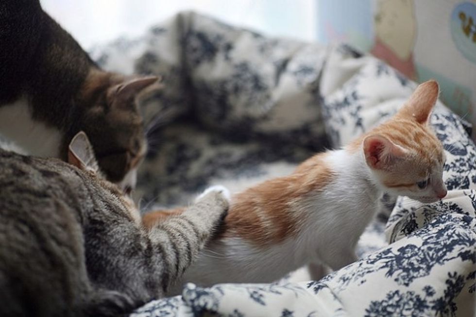 While Little Mau was staying with her foster mom, she was greeted by three very friendly cats - all of them are also rescues themselves. They were curious about this new kitten, sniffing around and exchanging nose kisses with her. Little Mau was initially a little spooked by the three larger cats, but soon calmed down by their warmth and friendly manners. Right away she felt like a part of a big furry family.