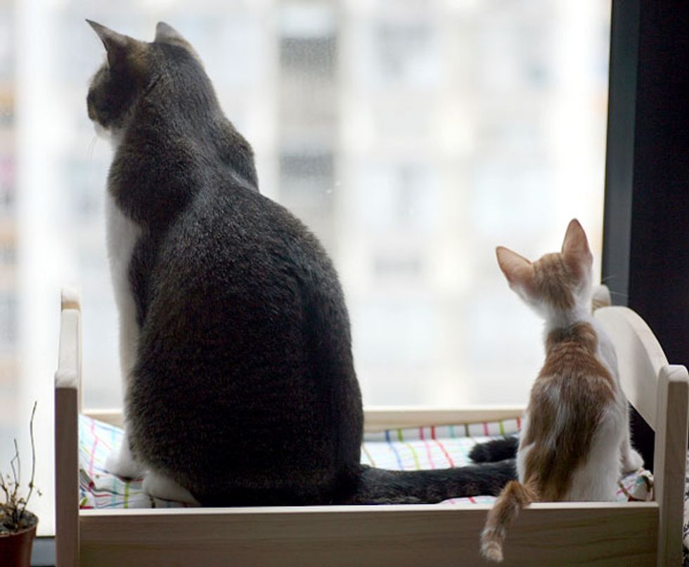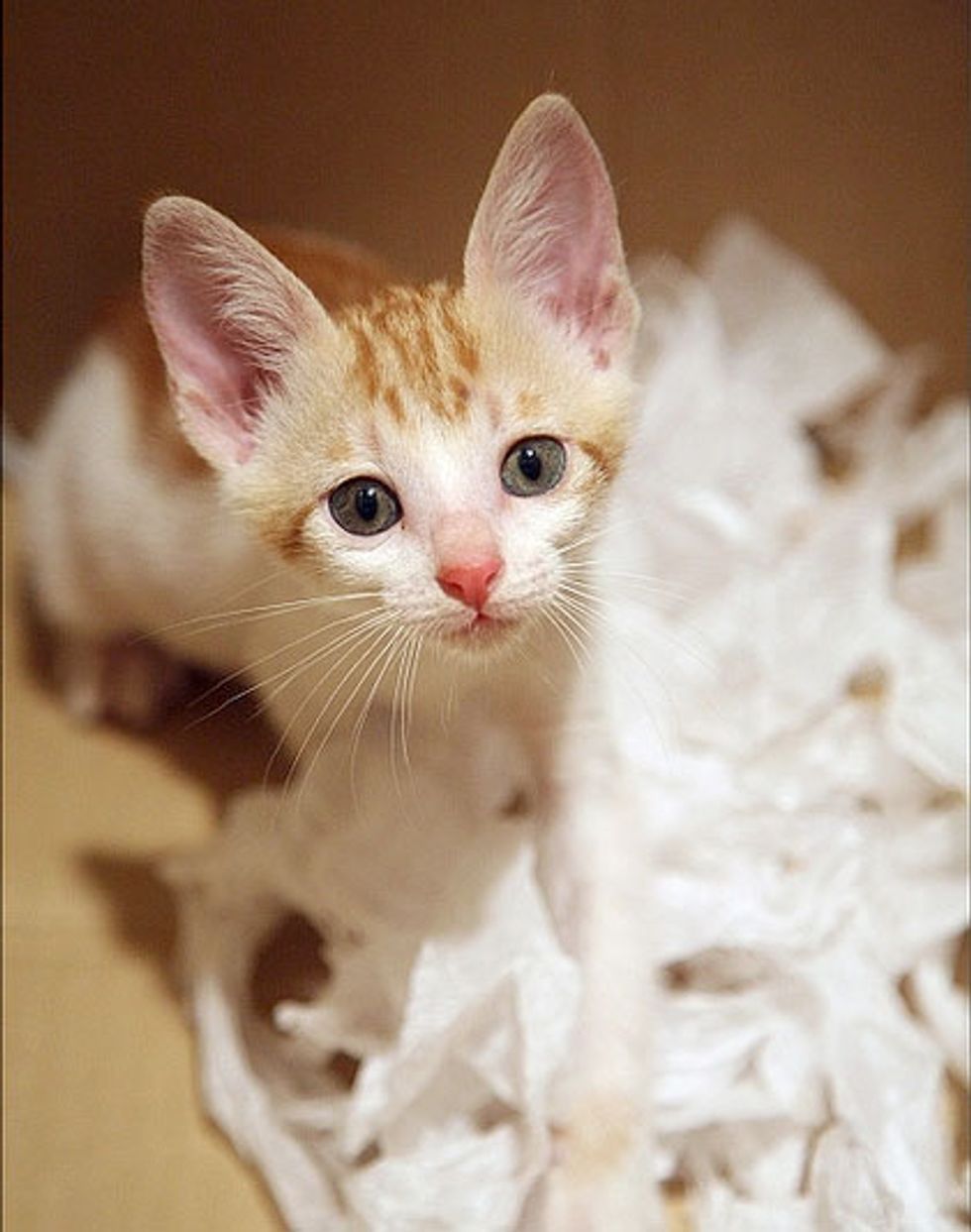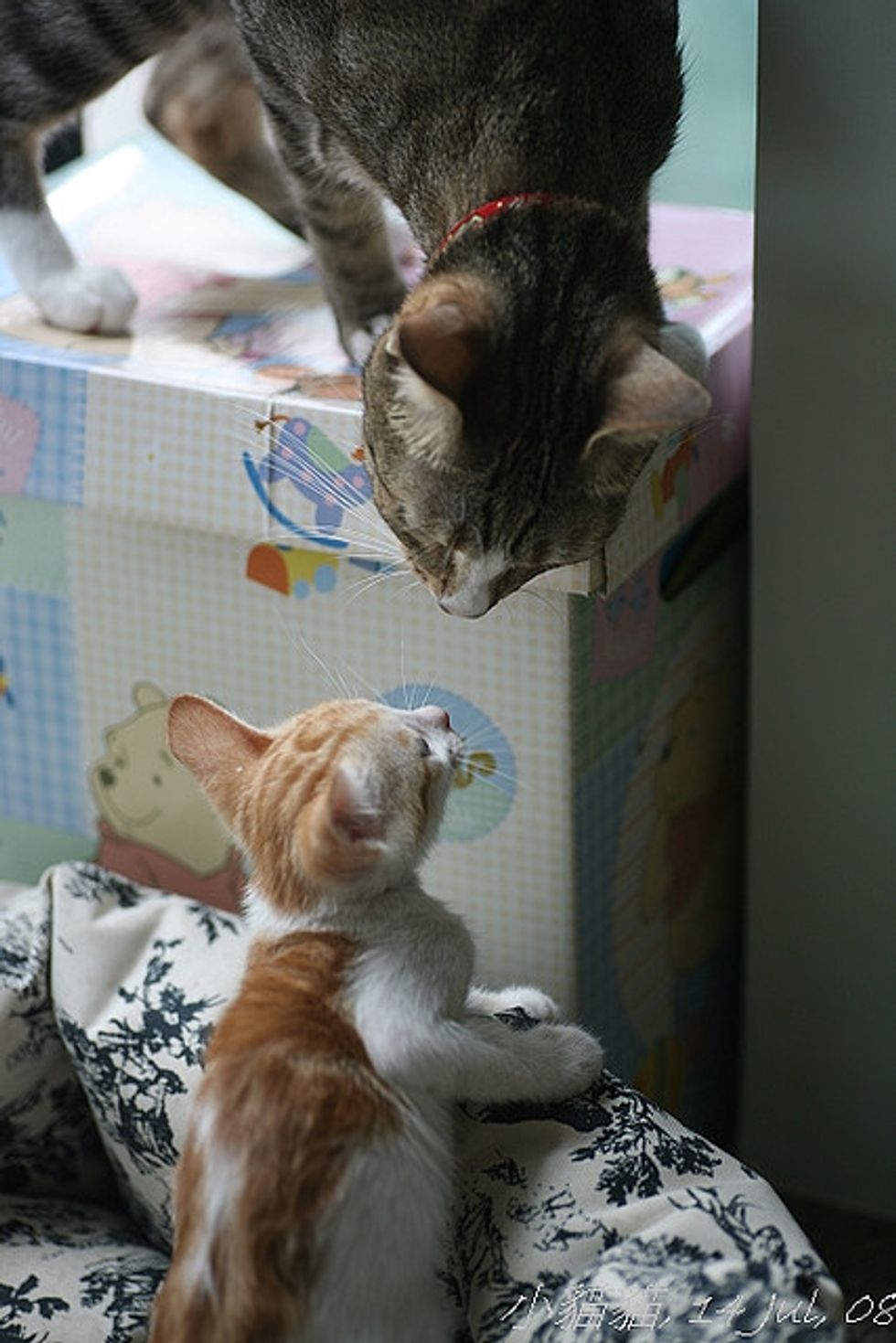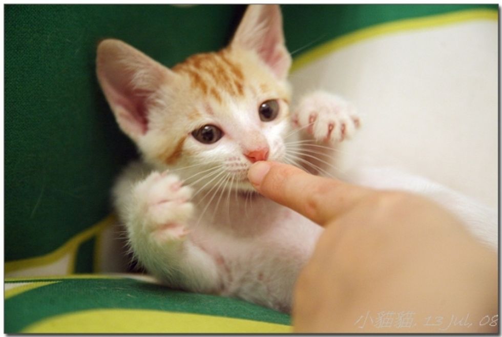 While Little Mau was staying with her foster mom, she was greeted by three very friendly cats - all of them are also rescues themselves. They were curious about this new kitten, sniffing around and exchanging nose kisses with her. Little Mau was initially a little spooked by the three larger cats, but soon calmed down by their warmth and friendly manners. Right away she felt like a part of a big furry family.
