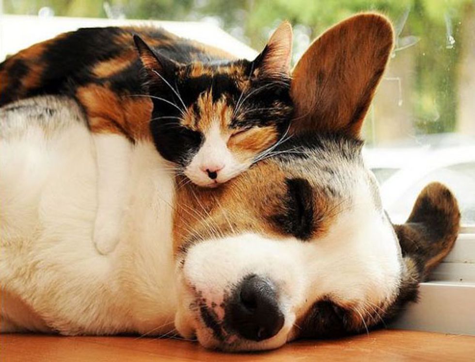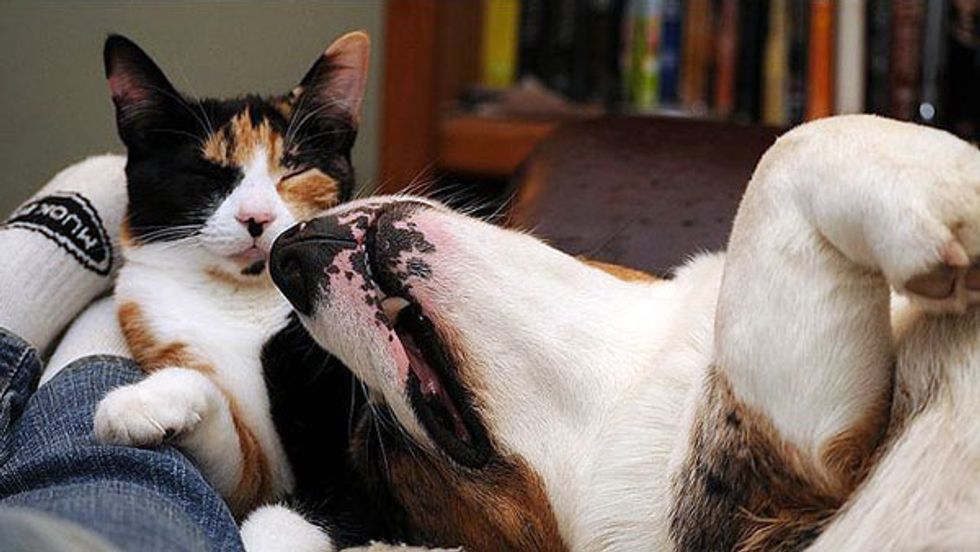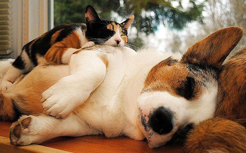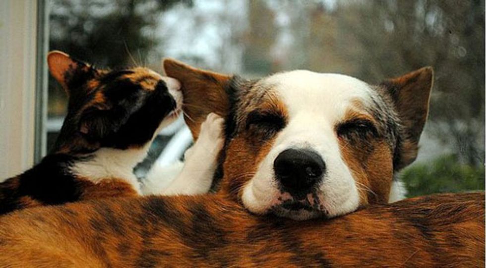 Sophie a beautiful calico kitten was adopted by a family with many furry friends. One of them is Simon, a friendly Corgi who immediately took to her and they became insparable friends. We featured them when Sophie was a little kitten. Today she's grown into a gorgeous girl and her friendship with Simon has only gotten stronger. Here is a little update from Sophie :).