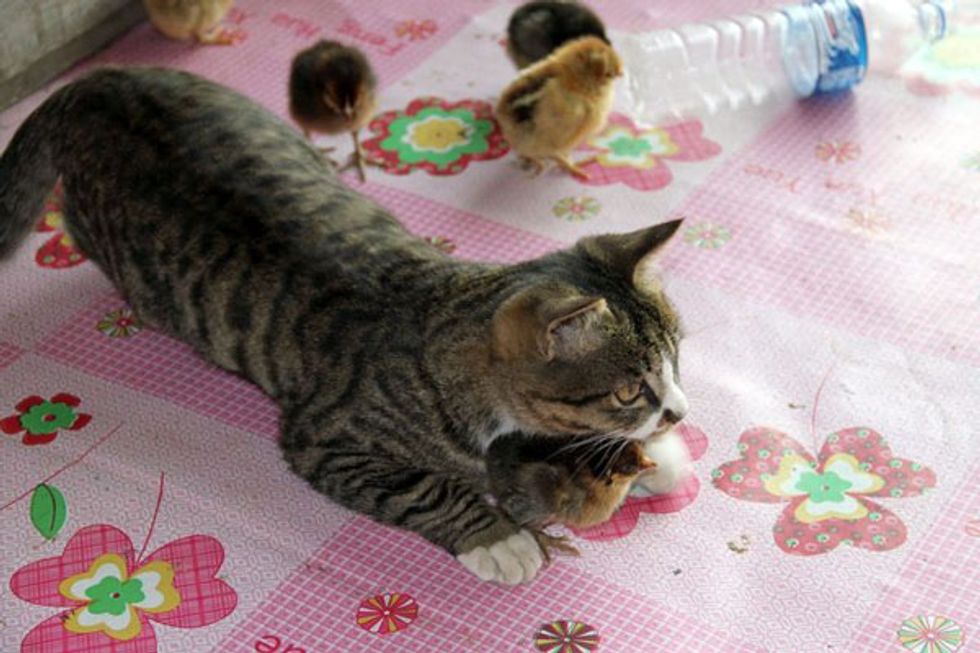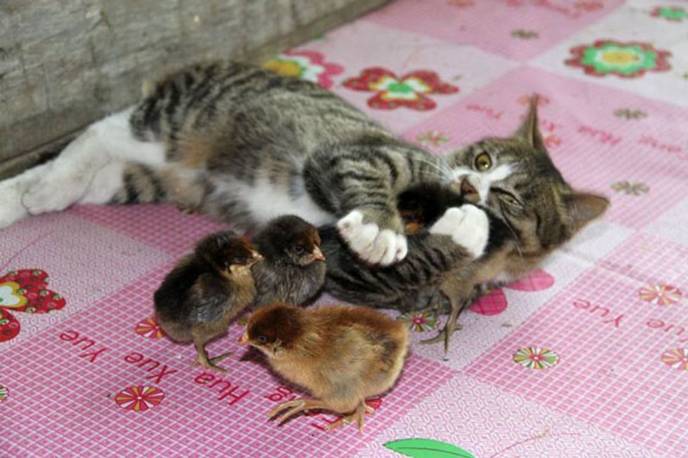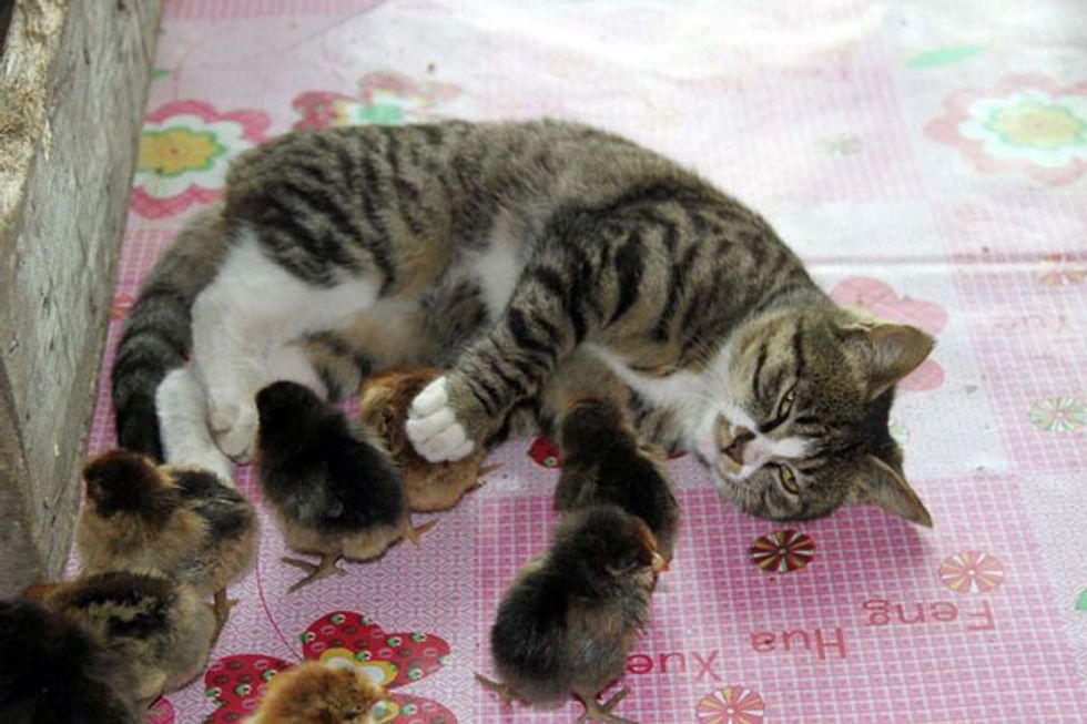 A Chinese farmer Lao Yang had thirty chicks that he placed in an enclosure next to his bed. When the little chicks escaped, Lao was afraid that their house cat would find them as prey, but something unexpected happened. The cat became like a mother to the little chicks, grooming them and treating them like her own. The chicks love running and chasing the cat. How cool is that!
