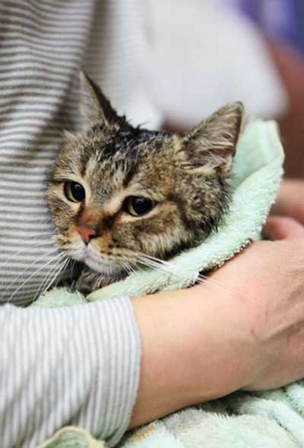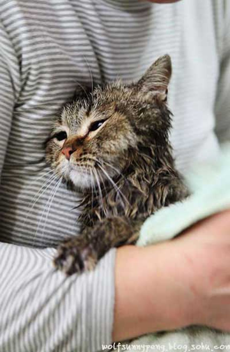 After they successfully brought the kitty home, she was given a needed bath. "The kitty was extremely sweet during the bath and let my mother wash her without any complaint," said Lang. When they wrapped her up in a towel, she immediately switched on her purr motor and snuggled against her fosterer like a joyous little child who is so happy and thankful to be loved and cared for. "At that moment we knew that we just couldn't let her go and she is here to stay with us forever."