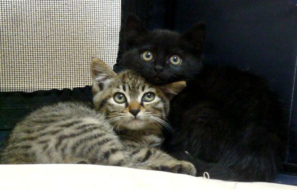 They were spotted on the street by Yamami who was on her way to the grocery store after work and heard kittens crying. The little kittens, one tabby and one black, were all alone by themselves, scared and hungry. Yamami brought them food, but they were too timid to let her get close.