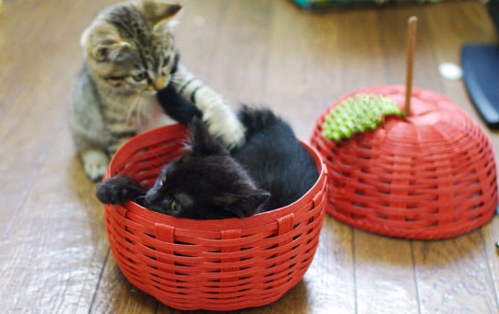 When Chika showed them a feather toy for the first time, they did not react to it, but in just a couple days, they were already chasing, biting and pulling it with all their might. They discovered a cat tree in their room and made it their little castle. Chika became closer and closer to the two each day. In less than a week, they let her pet them on the forehead and give them scritches.