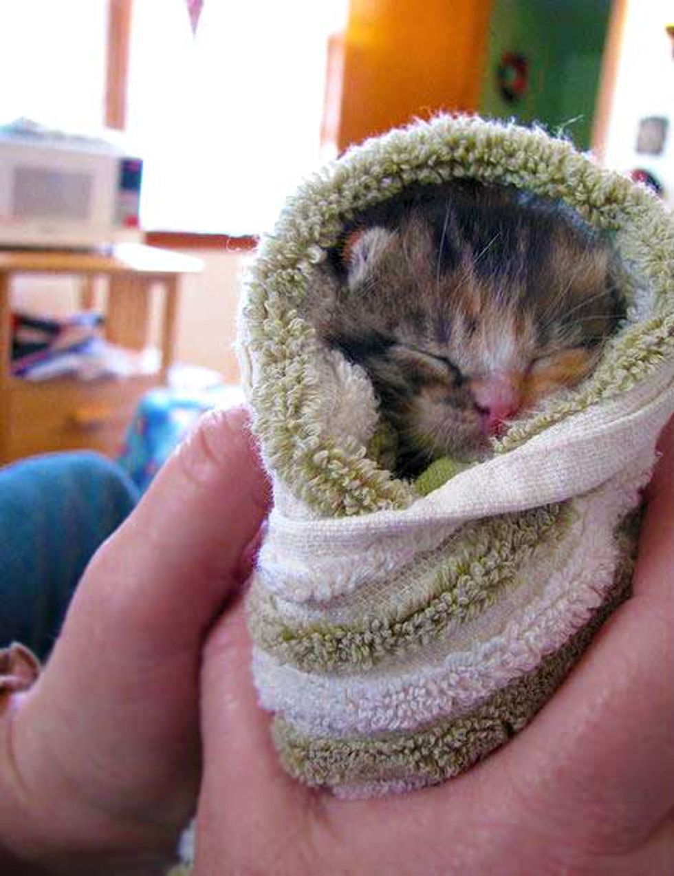 A little bundle of joy is kept warm and cozy. Wendy took in 5 orphan kitties. This tiny bitty one is the only calico in her litter. She is snoozing after a big meal.