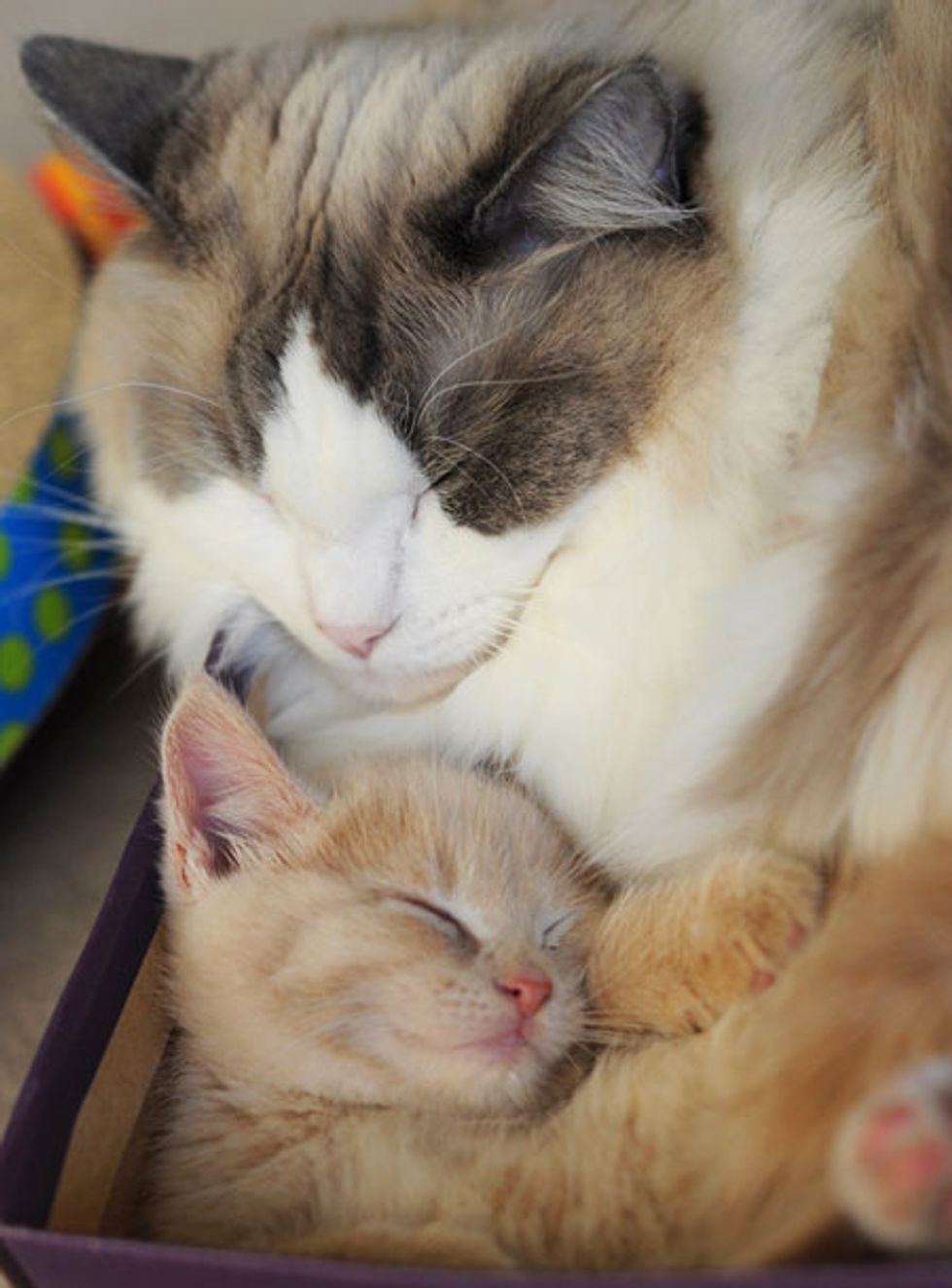 Dexter an one year old fluffy cat has a big heart for little foster kittens. Ever since Finn and Dash came to their foster home, Dexter has taken to them with open arms. He is like the furry dad that the two orphan kittens never had [edit: their cat mama Norma is in the foster home too]. Dexter is teaching the kitties how to be a man-cat.