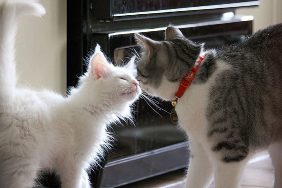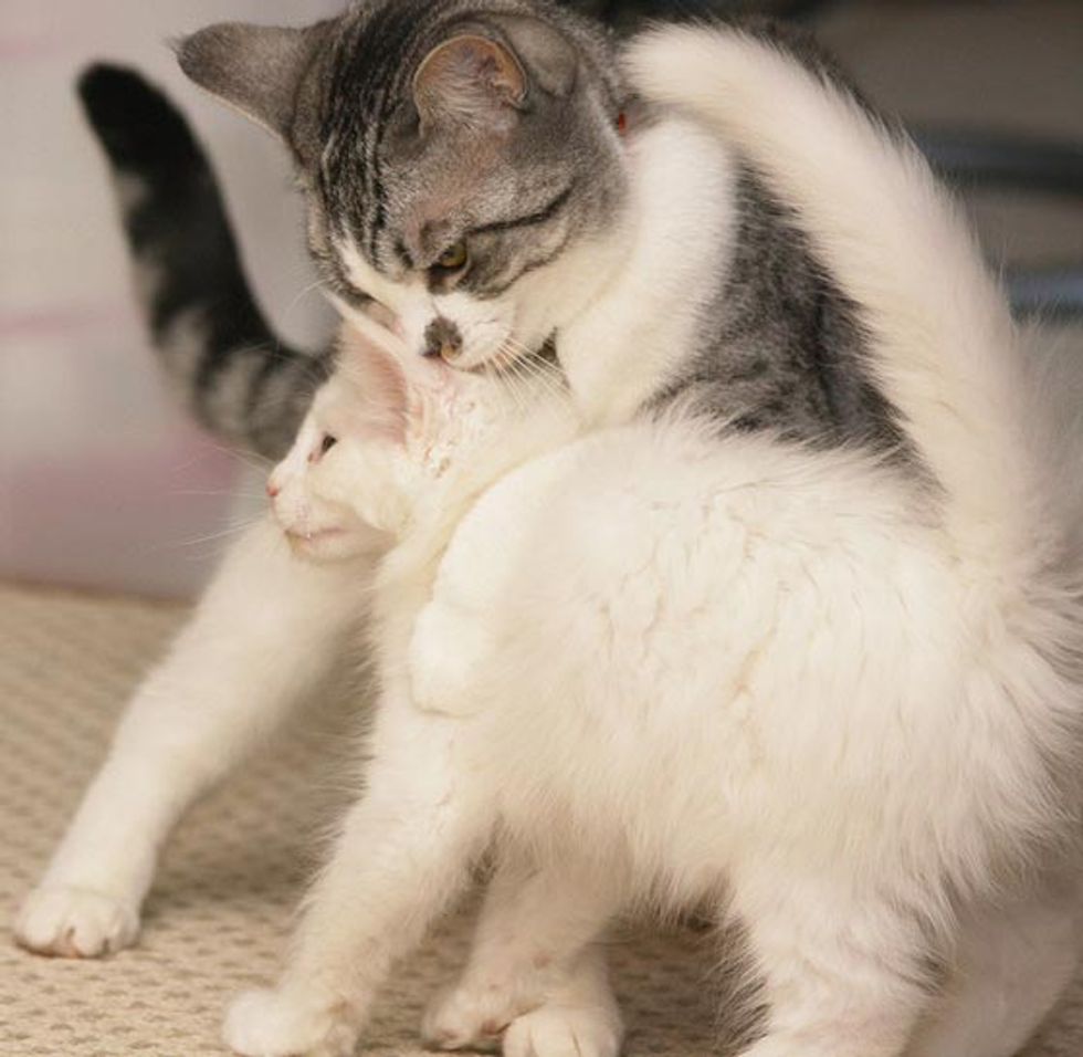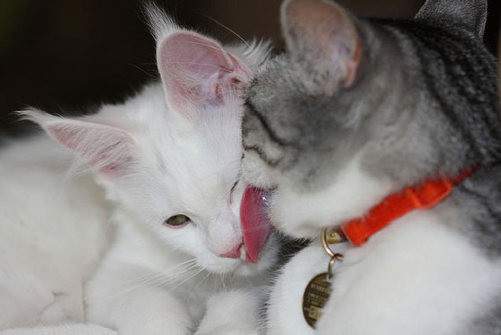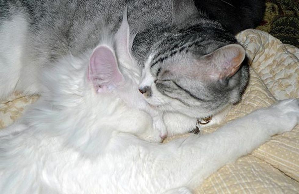 Tink dotes on the little white Maine Coon as if she were her own kitten. She gives her bath everyday and nuzzles next to her like a mother would to her kitten.