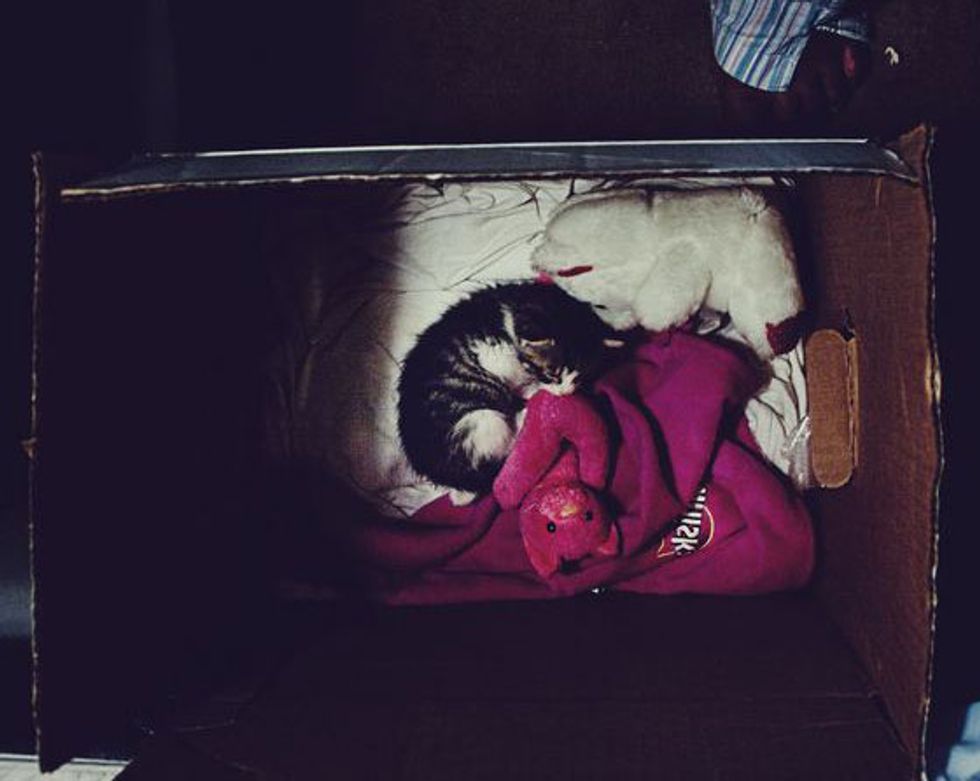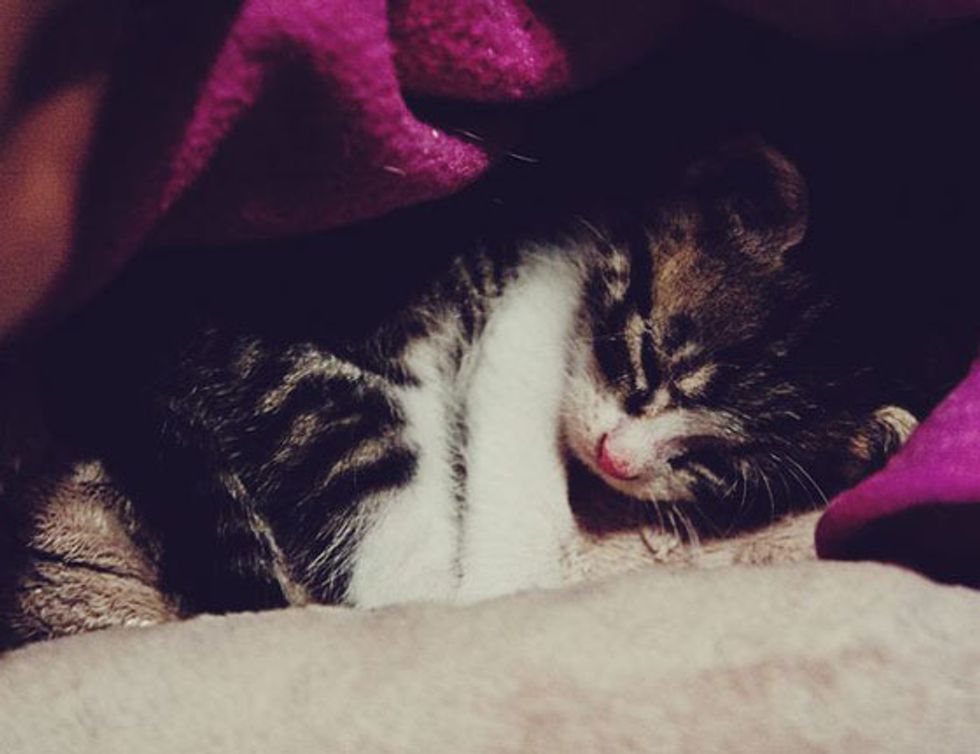 A tiny kitten was spotted by Sarina one day in an alley of a busy city when the little kitty's crying caught her attention. "When checking her out, I could only feel her bones. She was very malnutritioned," said Sarina, who couldn't stand seeing the little one out fending by herself, so took her in and named her Alley.