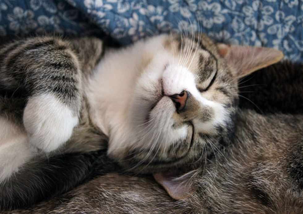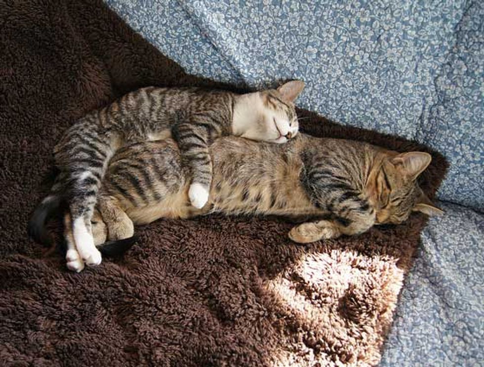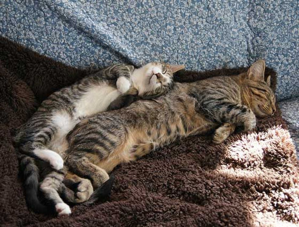 Happy smiley foster tabby cuddles his furiend to sleep. What a sweetheart!