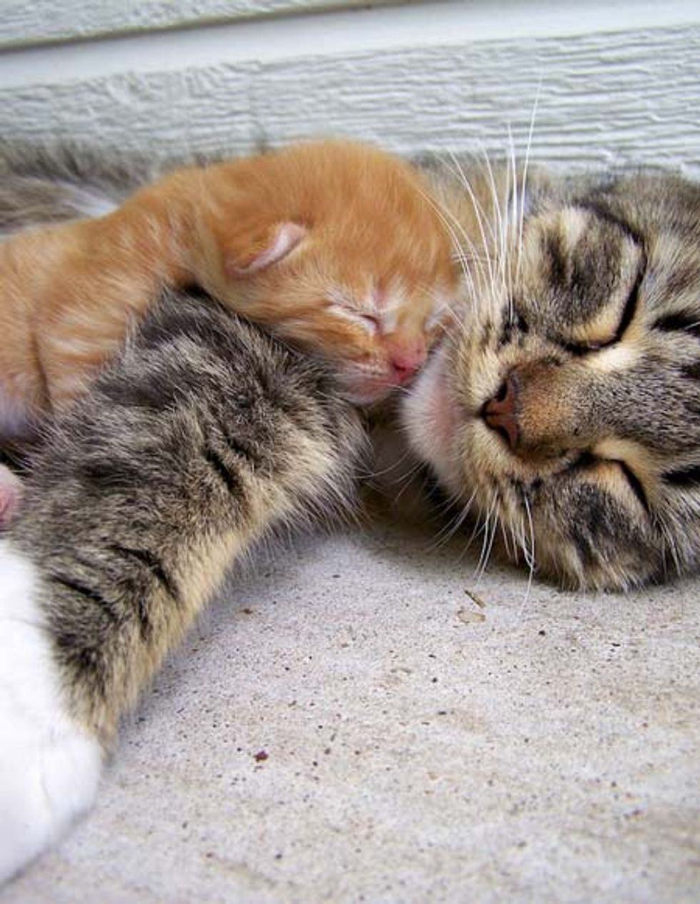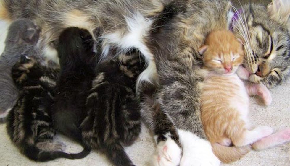 Photos by ©Kandace and Karla via Good Morning Kitten. Here is Xanadu taking a nap over his siblings next to his mom: