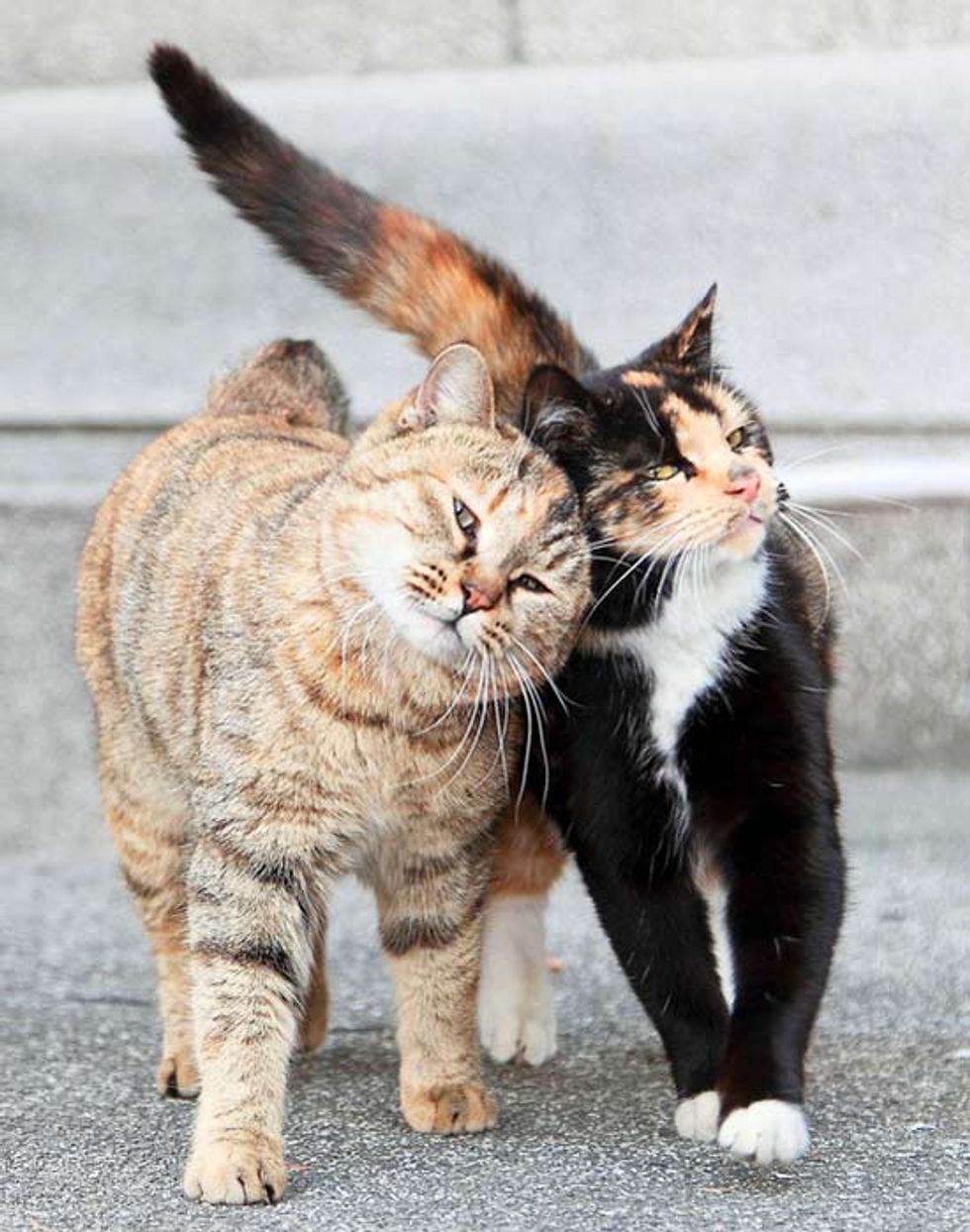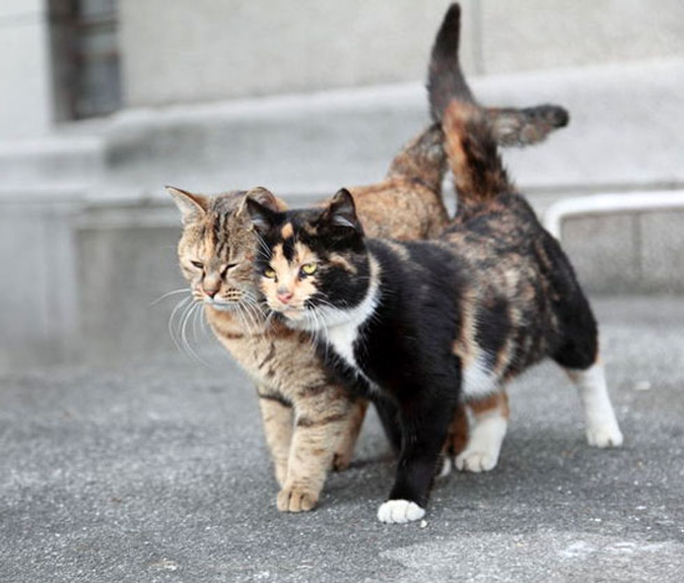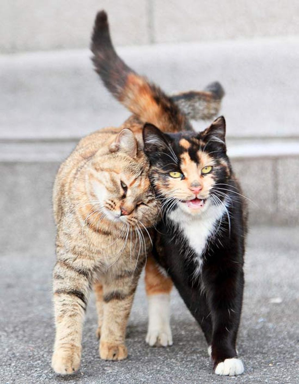 These two feral cats are spotted on a University campus in Shanghai. They follow each other wherever they go. They share food and warmth and lean on one another for love and comfort according to Jianfu. There is not a moment that they aren't seen together. What an inspiring pair!