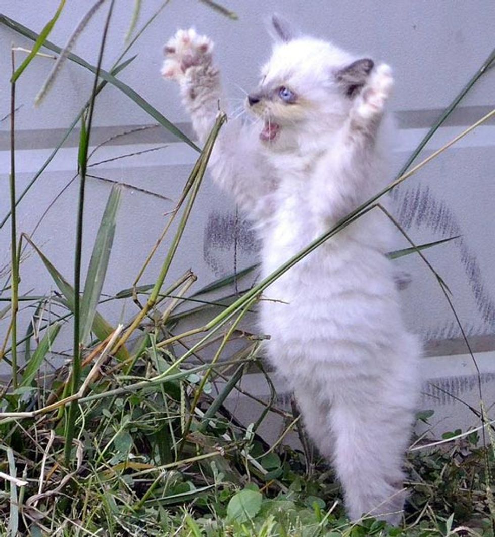 "I am gonna getchya!" said Captain Jack the kitty as he stands up on his two hind feet with his paws in the air, trying to catch the grass.