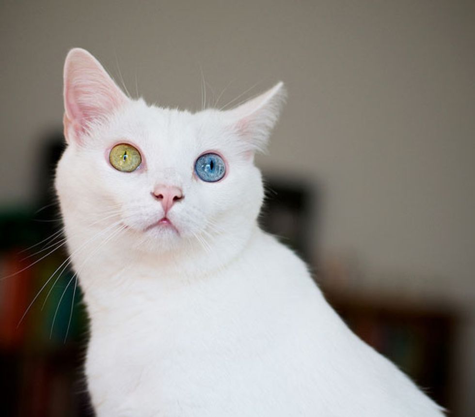 "June's condition is called heterochromia Iridum, which really just means different colored eyes. The woman who fostered them was initially concerned that it was connected to an eye infection around the time the yellow eye changed color, but our vet thinks it's most likely just genetic. Cats like this are sometimes deaf on the blue-eyed side, but June hears just fine."