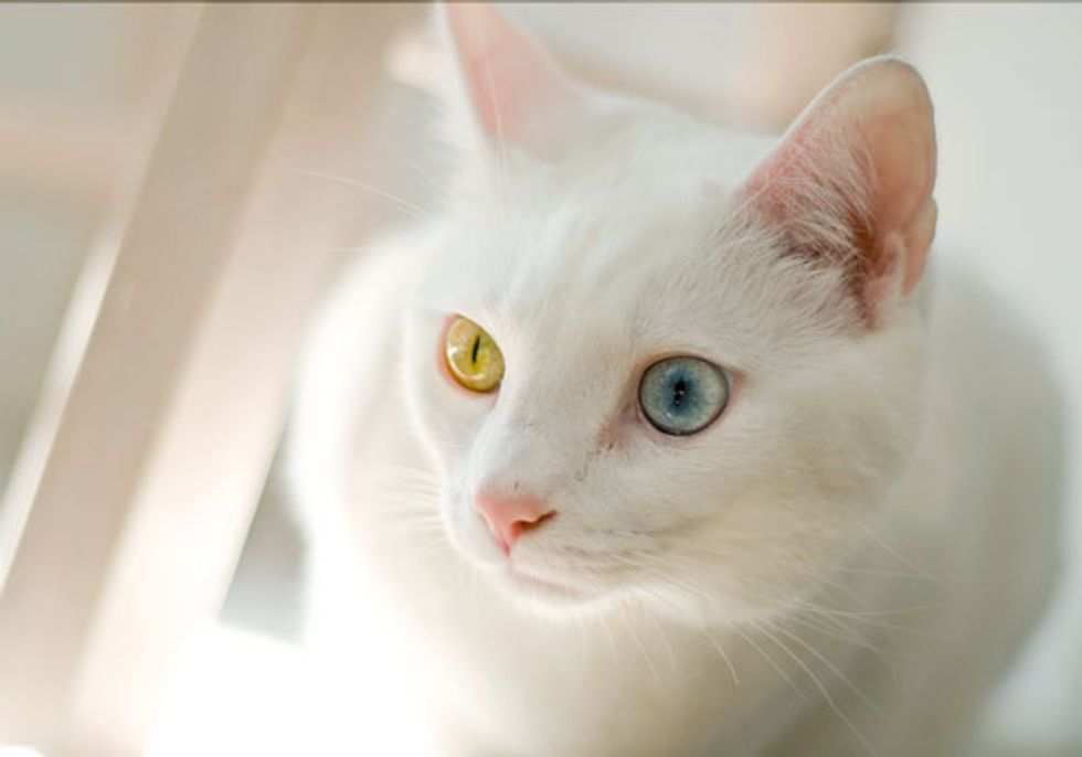 June the cat has the kind of beauty that turns heads whereever she goes. She is a snow white kitty with two distinctive colored eyes. One is yellow and the other is blue.
