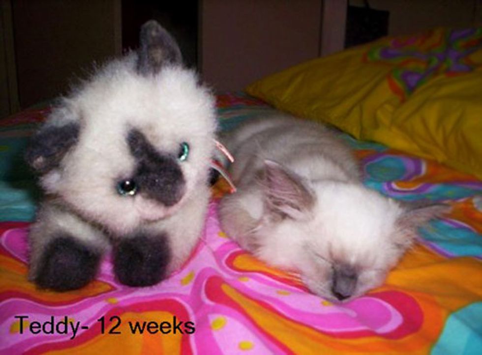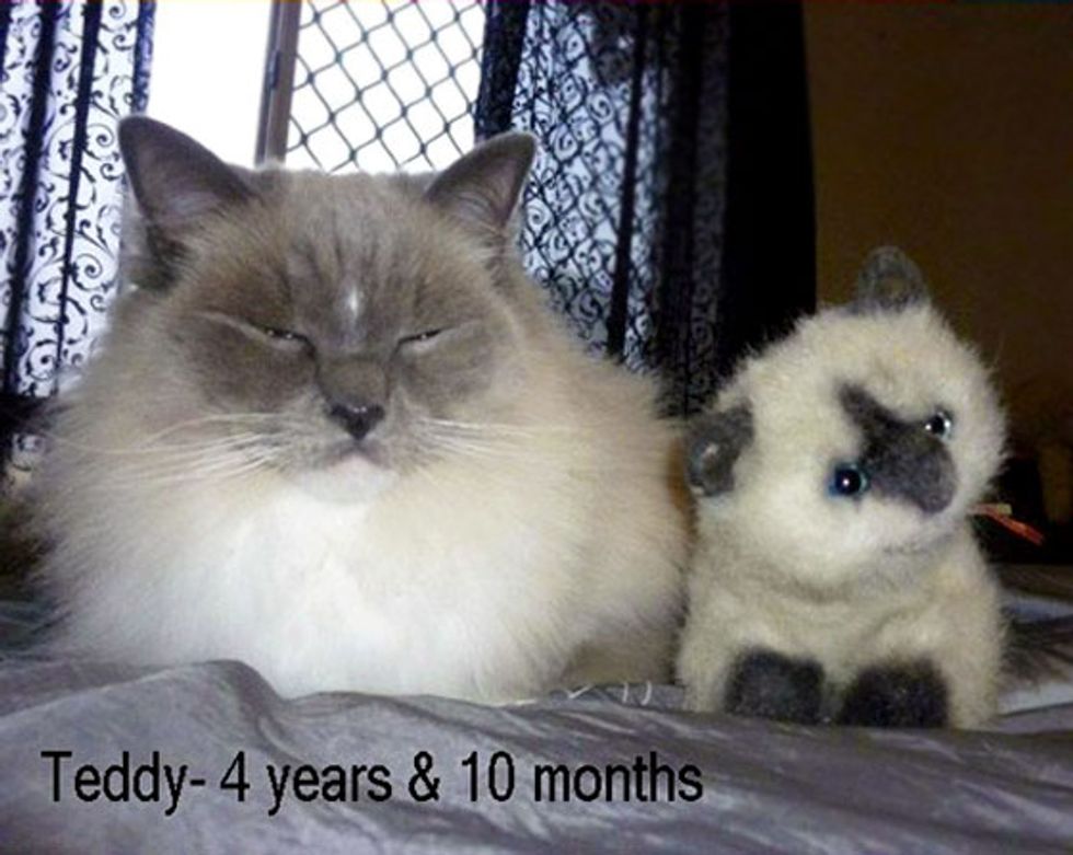 "This is my baby named Teddy-Bear. The first pic is of him on the day we brought him home (at about 12 weeks old) sleeping next to a toy cat I have. The second is of him with the same toy in August this year, just a few months short of his fifth birthday. I can't believe he used to be that small!" said Teddy's hooman.