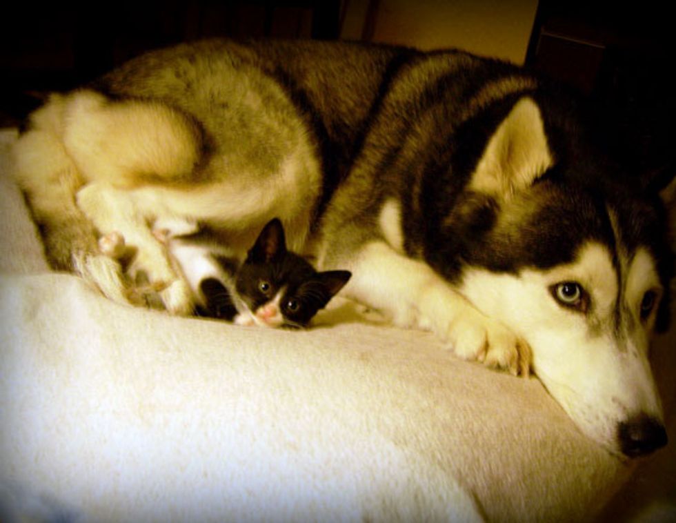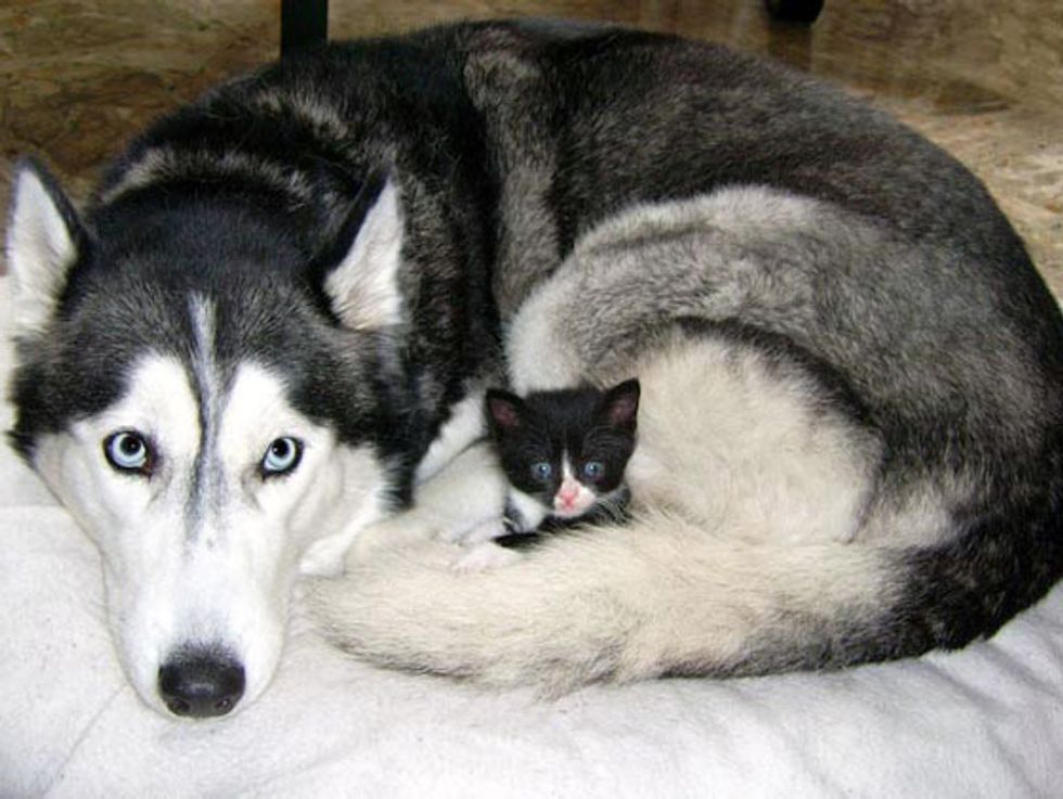 A teeny little tuxedo kitty found a new mom, a big Siberian husky who raised her and nursed her as her own.