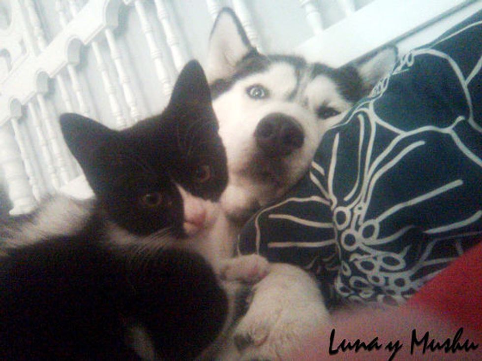 Mushu the kitty was born to a stray cat and later rescued by her human when she was only 8 weeks old. They had a dog named Luna who accepted Mushu as soon as she laid eyes on the poor little tux. Mushu also chose Luna to be her surrogate mom. They have been inseparable since.