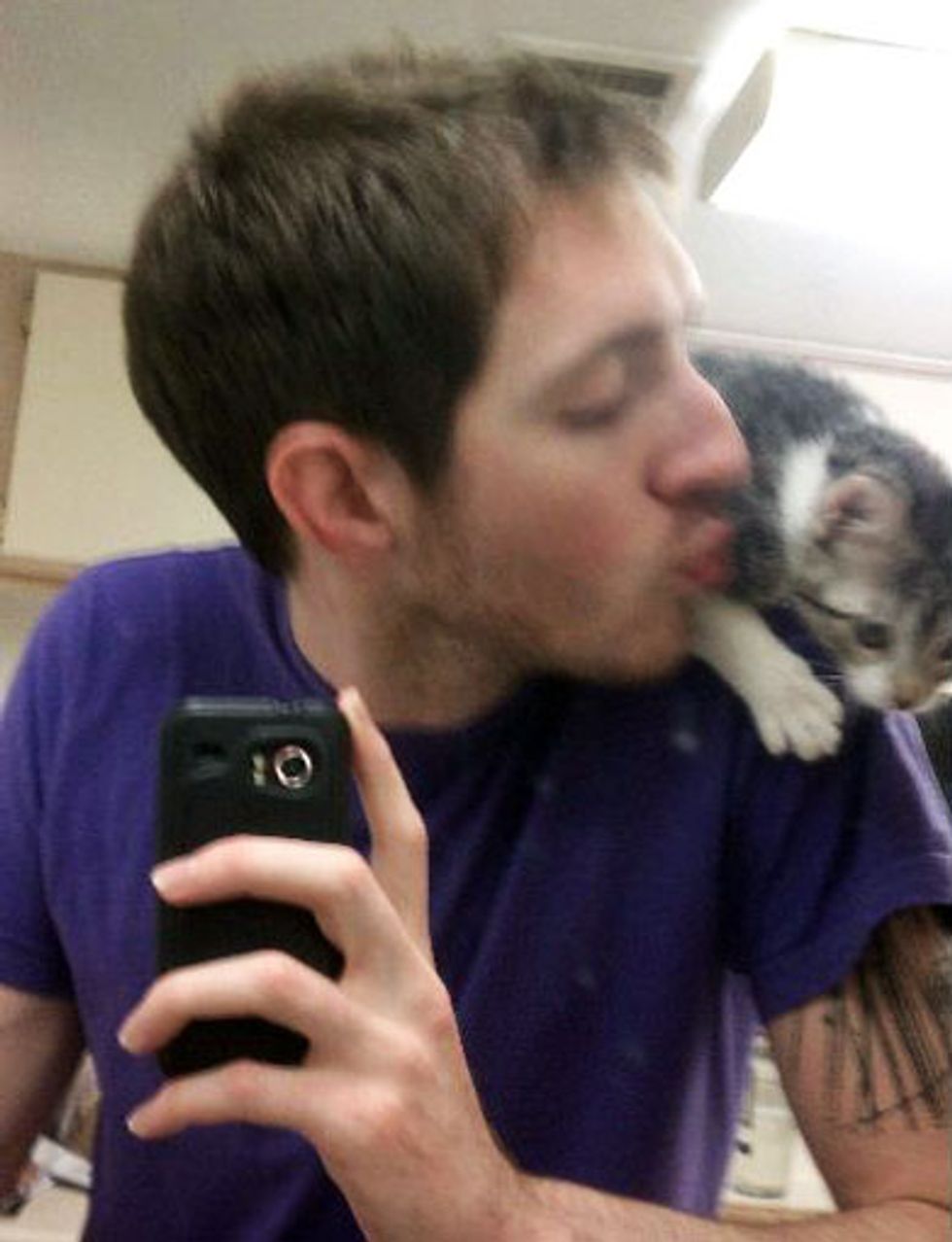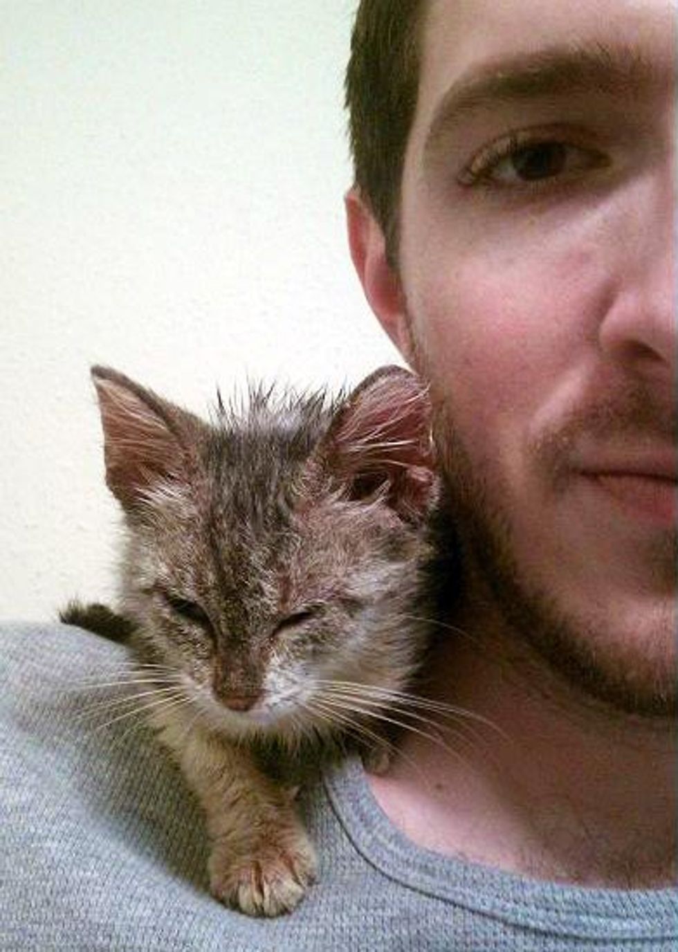 A tiny rescue kitty was lost, but later found by a man whose shoulder became her favorite perching spot.