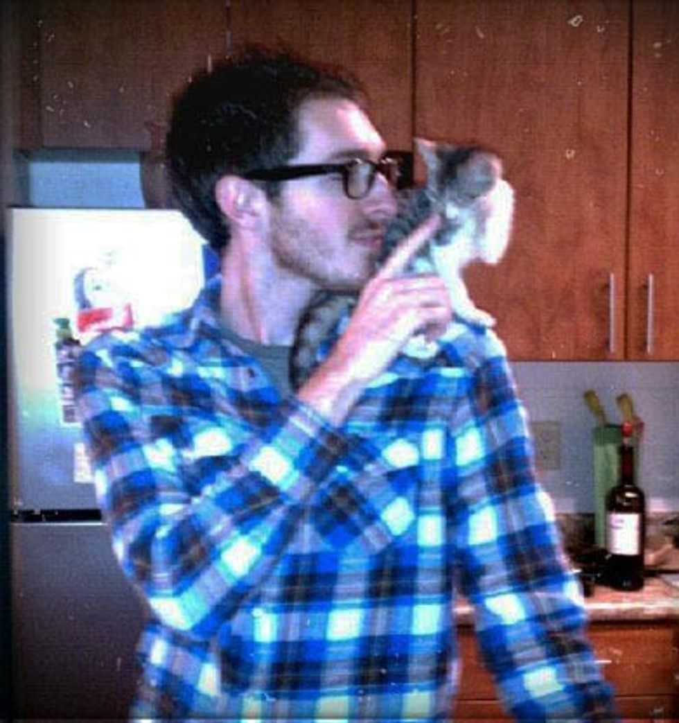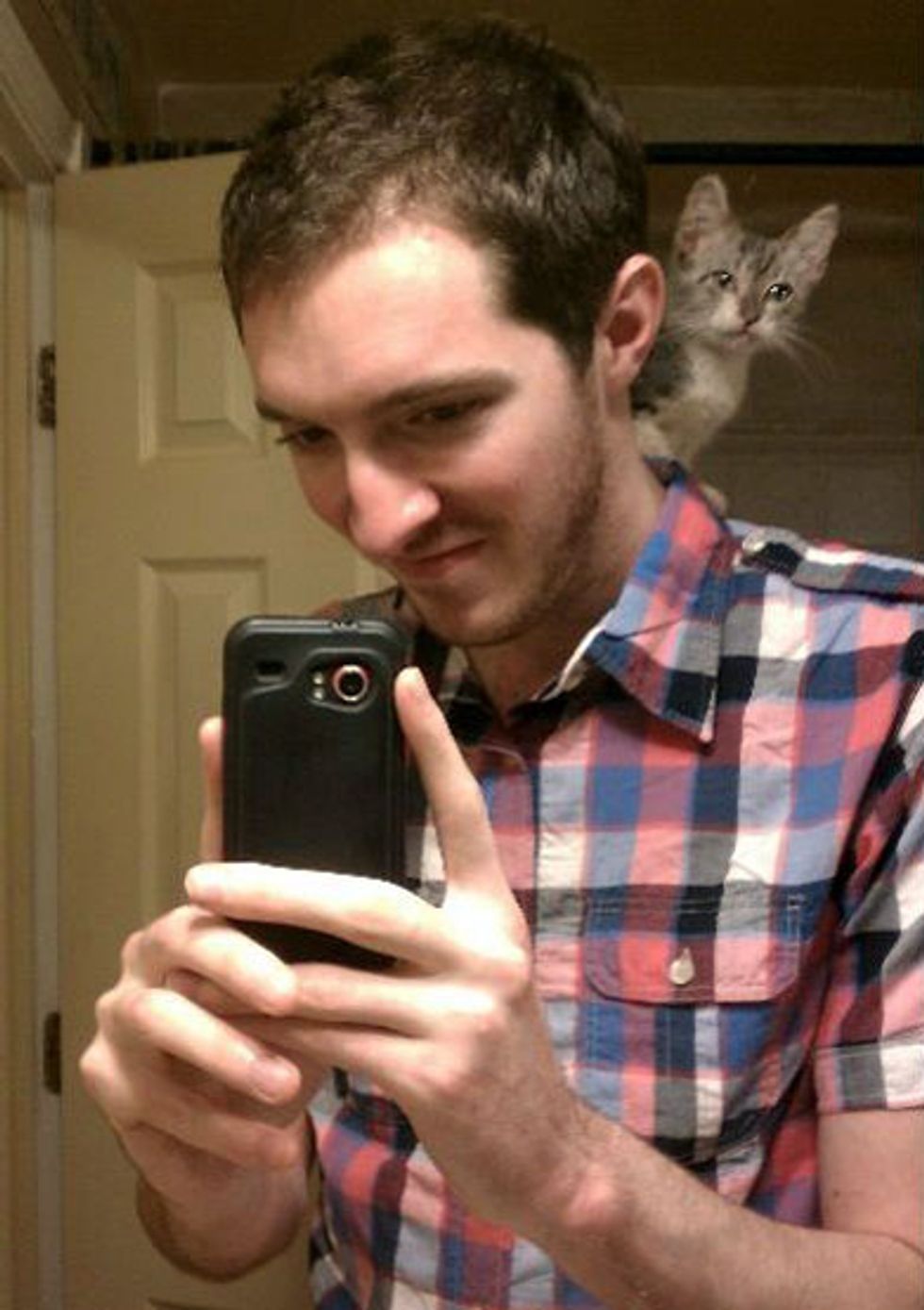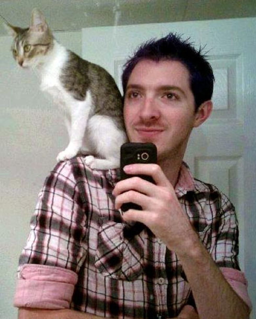 Kitty all grown up, still climbs up on her dad's shoulder as soon as he walks in the door: