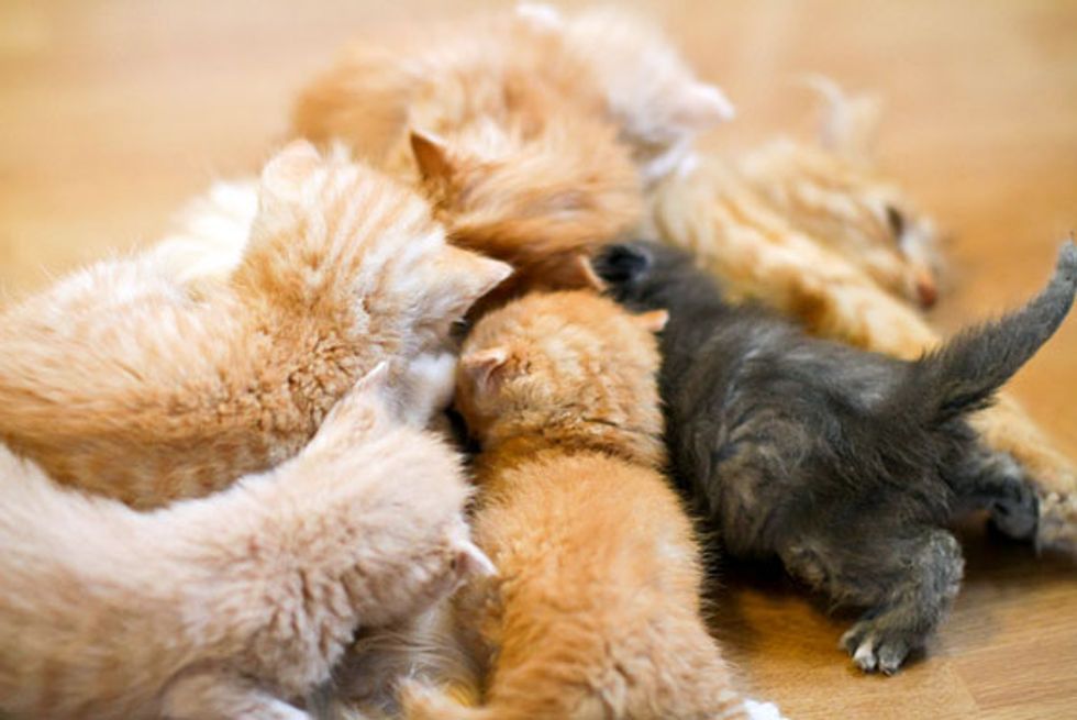 It's a feeding frenzy. Sunshine the rescue cat mama has a litter of six very hungry mouths to feed. The diligent cat mama is literally buried underneath a pile of squirmy fuzzballs.