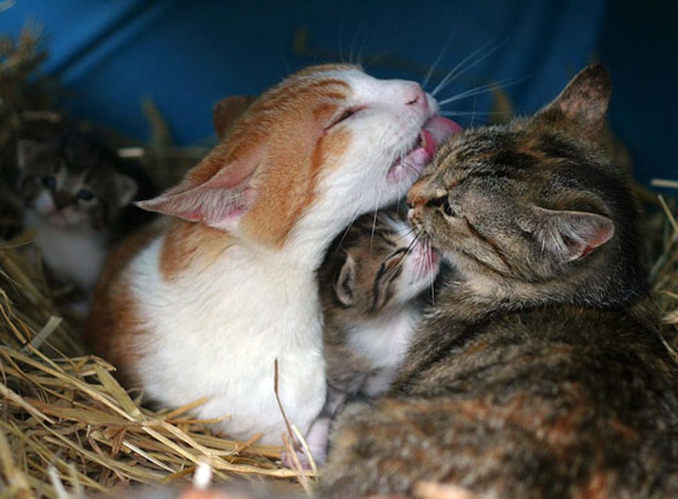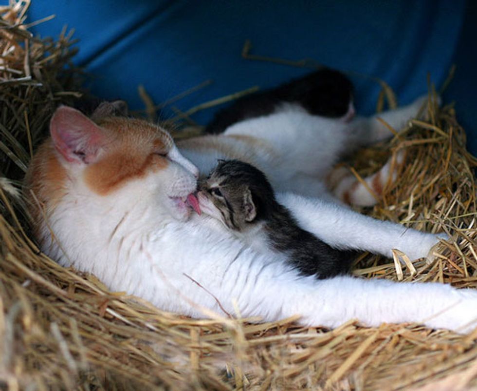 Specter is unlike other feral cats. He has a heart like a parent. Whenever he sees little kittens, he ears perk up and he takes to them as if they were his own. "We call him 'The Babysitter' because when the kittens were tiny, Specter would always lay with them. He would lick and groom them, and sometimes we'd even catch the babies trying to nurse off of him." He likes to sleep in the hay with the kittens and "kisses them all over, just like a mother cat."
