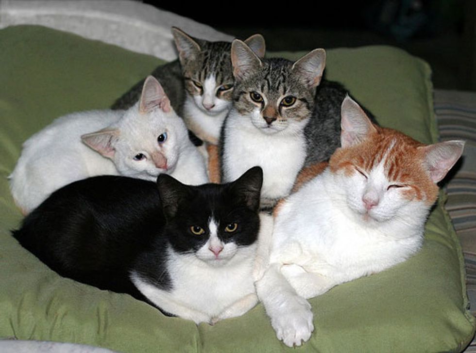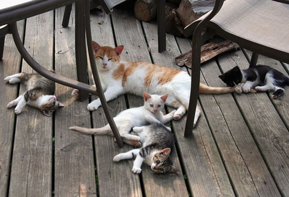 A feral cat named Specter is the babysitter to many kittens from the barn. "Specter is a male cat that showed up here a couple of years ago. At first we only saw fleeting glimpses of him running to and from our barn (so I named him 'specter' - like a ghost). Eventually he became brave enough to come up onto our deck, where all of my cats get fed... He's finally grown to trust us and is one of the sweetest ccats I've ever met," said Liv, animal lover from Southern Indiana.