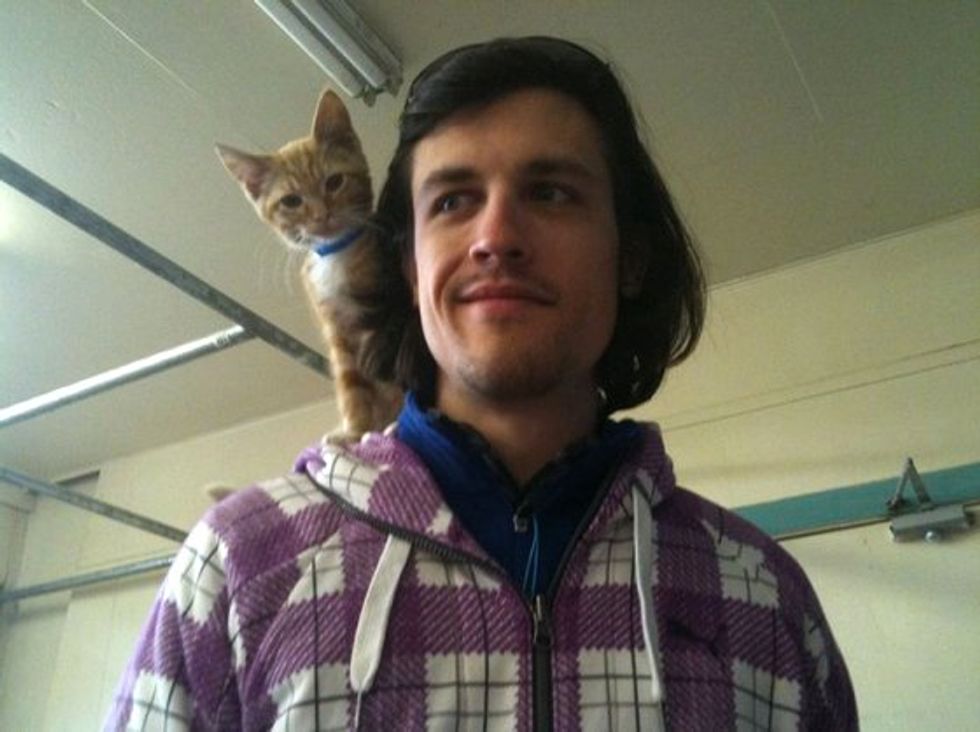 Kate says: "When we first brought our kitty Squid home, we put him in the cat carrier for the car ride. He attacked the bars until I let him ride on my shoulder inside my jacket, and he was content the rest of the ride. Ever since, he seems to spend most of him time on my shoulder or my husband's."