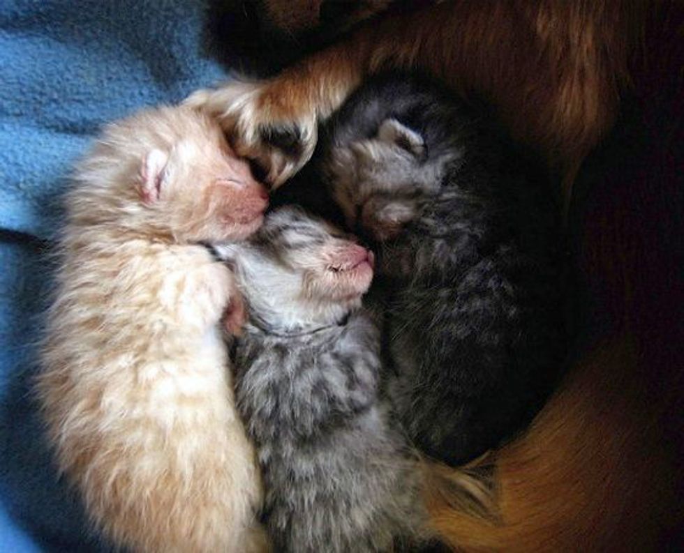 These tiny ones' eyes were not even opened, when they were rescued and taken into their new home. The kittens nuzzled into the dog as if she was their mother that they had never had. Immediately the dog adopted the fuzzy kittens and kept them by her belly to cuddle up with.