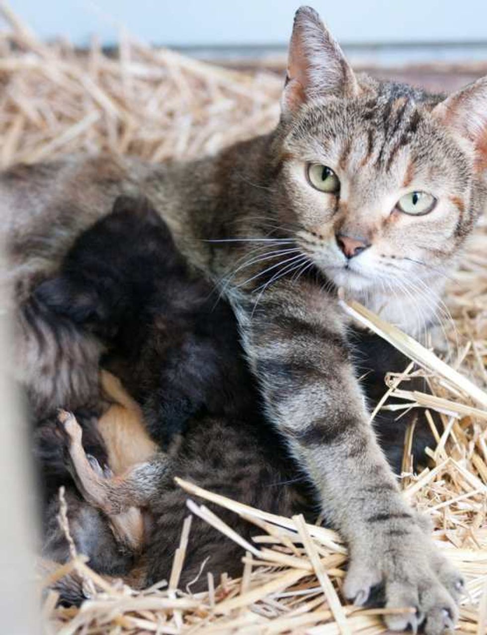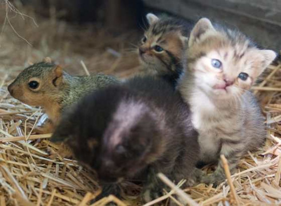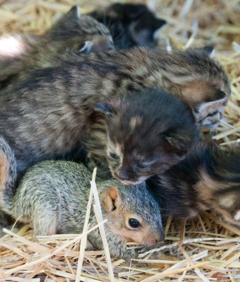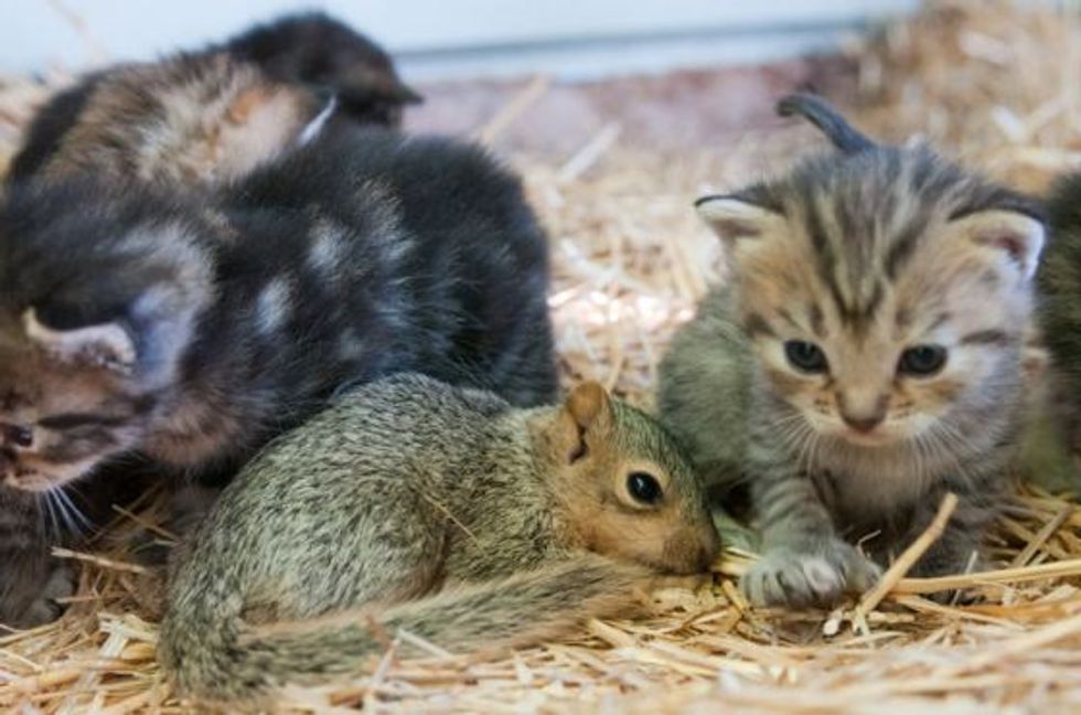 Oreo the cat mama adopted a tiny orphan squirrel and is nursing it along with her own 5 kittens. The baby squirrel was found crying "among the leaves and pine needles on the ground" out in a wooded area. They placed it next to the cat mama and her kittens, hoping they would accept the little guy. They did!