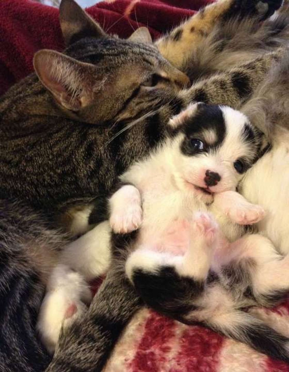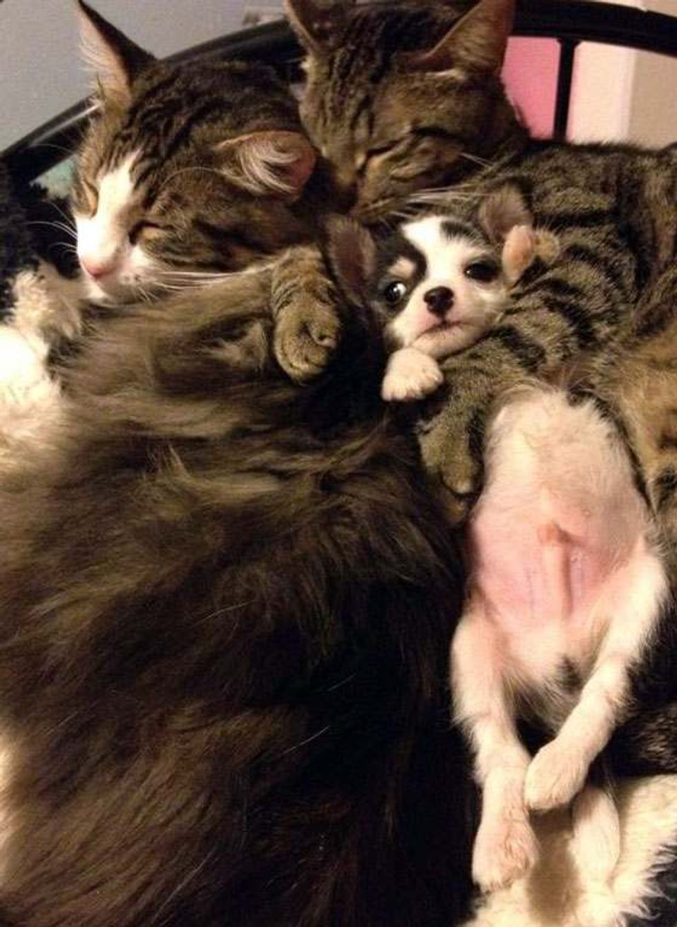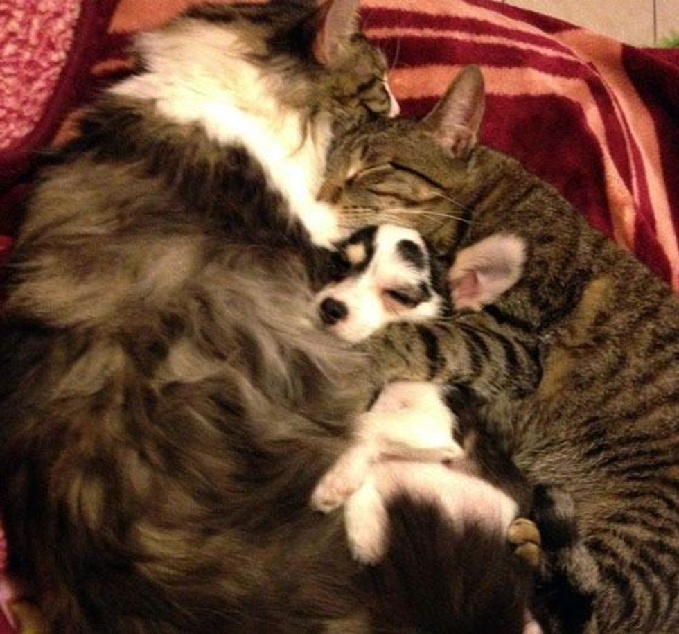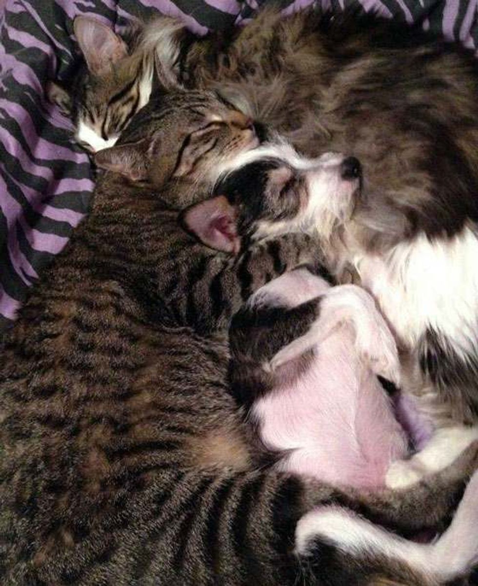 "...6 months in but it's like the first day all over again.... The dog is now almost the same size as the cats but he still likes to snuggle with them whenever he gets a chance and Whiskey (the furry cat) is in a good mood.... He's been with the cats since he was 4 weeks old," said Mimi via reddit.