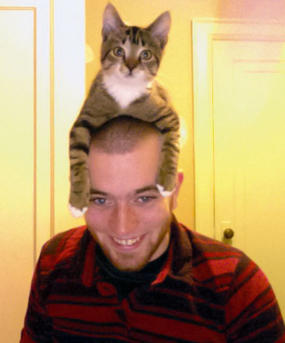 "Everyday after work I'll pick him up and drape him around my shoulders for a while. He just chills out and enjoys the ride. For whatever reason while sitting at the computer I put him up on my head, and he actually stayed there long enough for me to open PhotoBooth, and get a couple pictures. :) I guess he's just comfortable sitting on me," said catonlap via reddit.