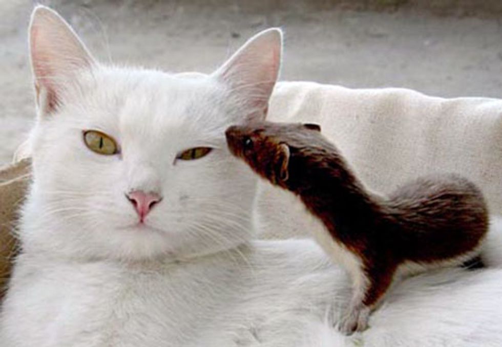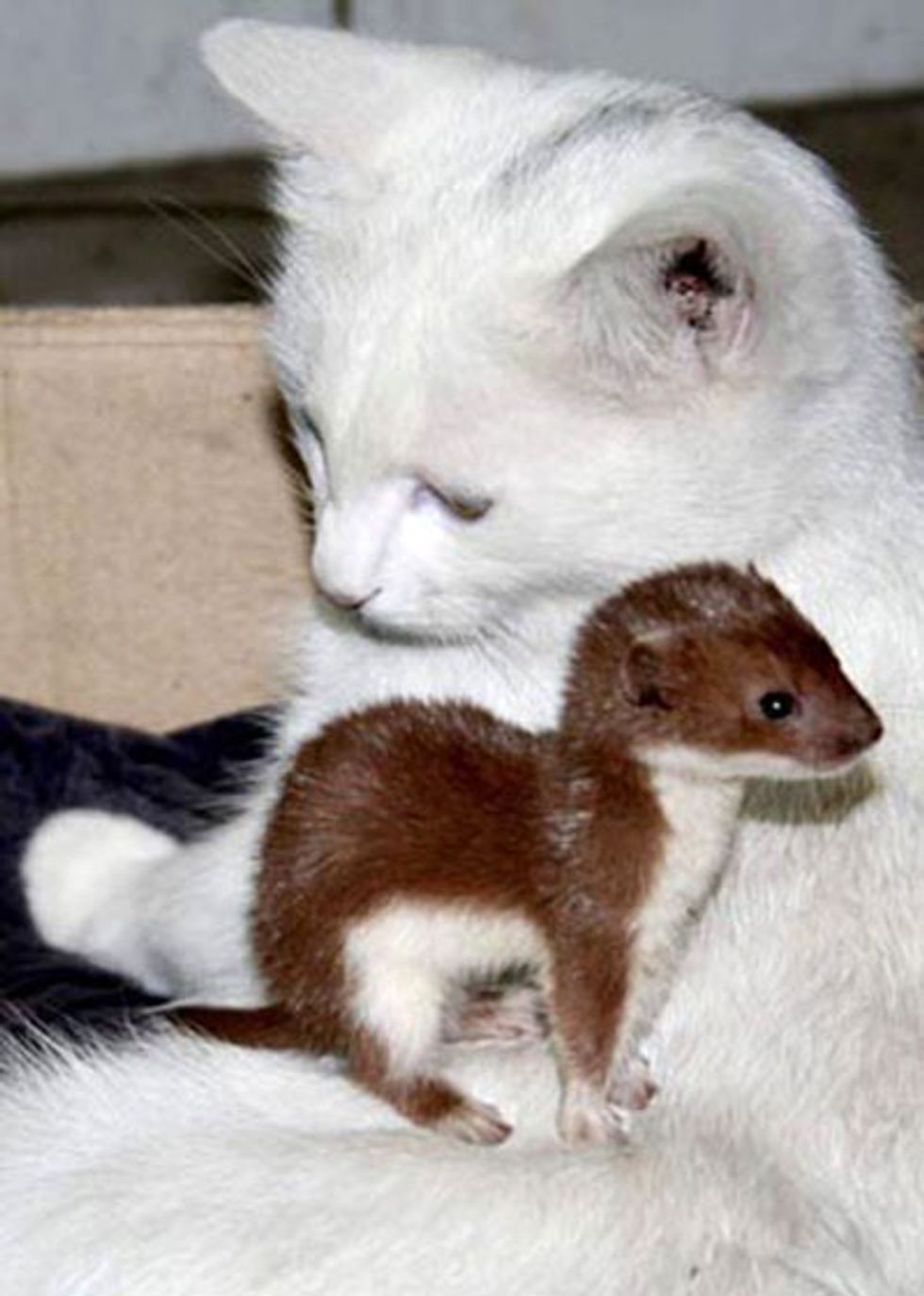 They say cats and rodents are natural enemies, but this cat not only doesn't mind a little rodent, she has adopted a weasel and cared for it as her own.
