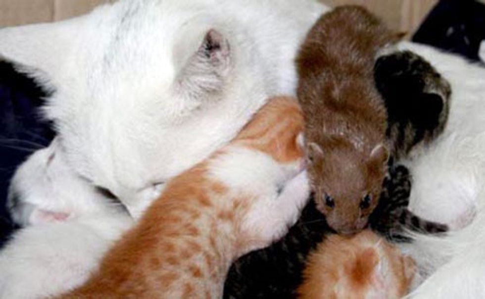 A pregnant cat from Xinjiang Autonomous region in China found a little orphan weasel. "The [weasel] was brought home July 21.... Even after the cat gave birth to a litter of five kittens on July 23, they got along well with each other," reported China Daily.