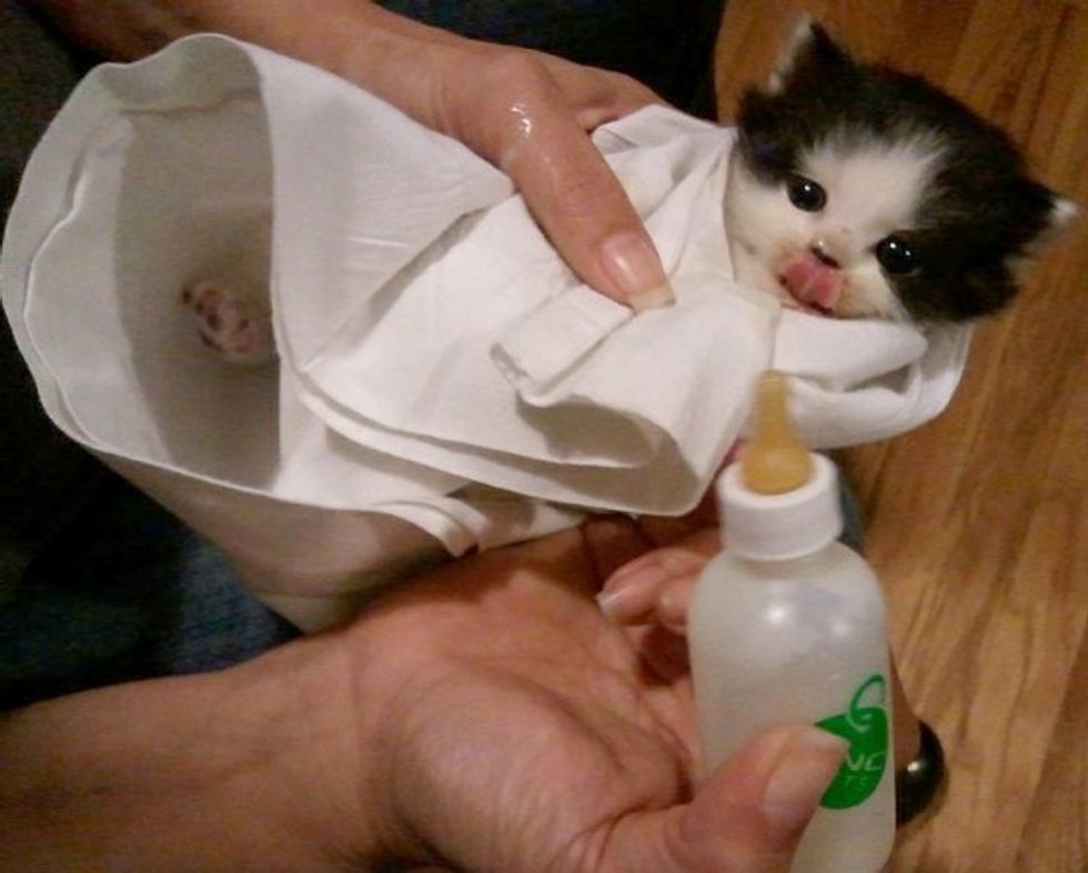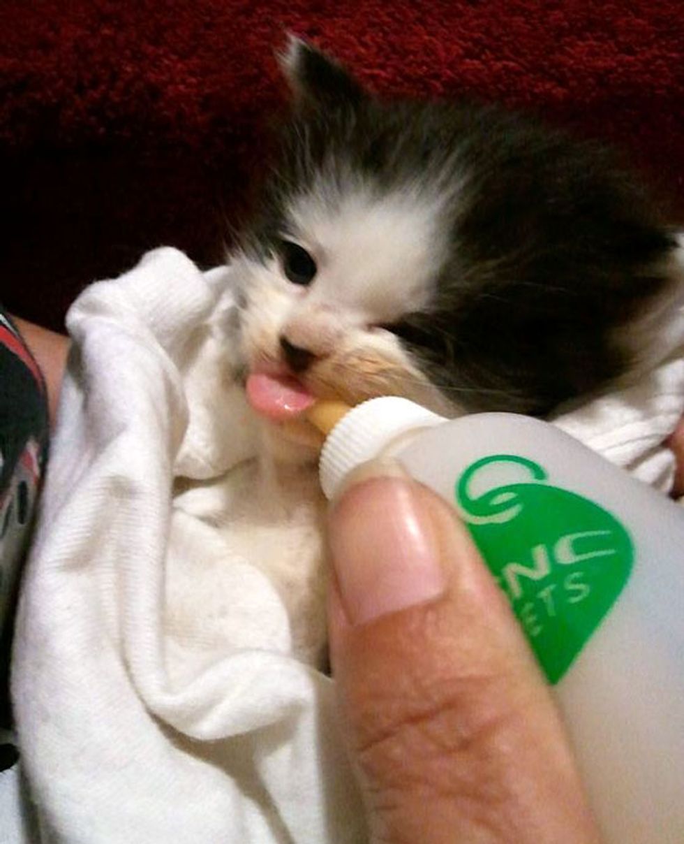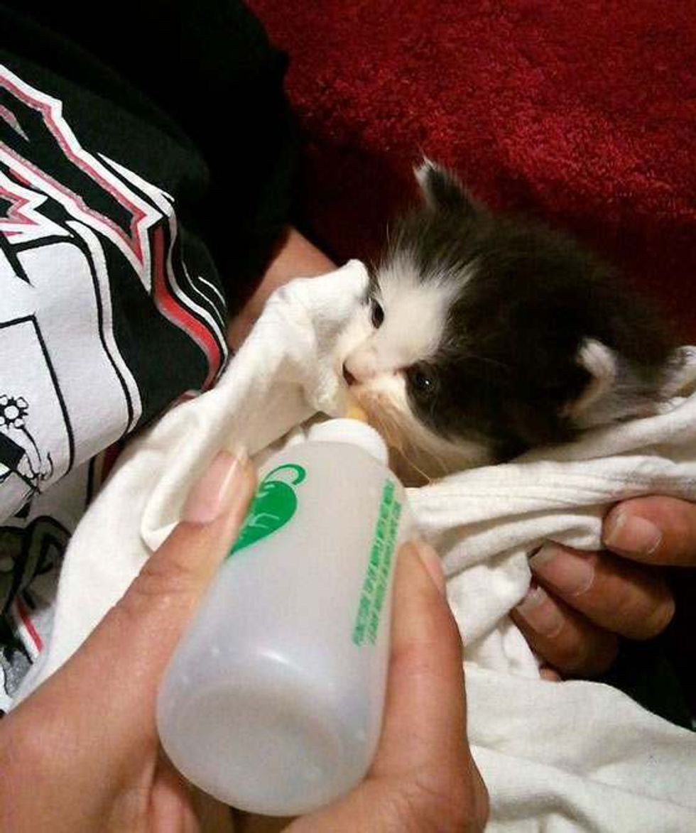 "Here he is being bottle fed every 3 hours. He has since been adopted by the EMT who found him and lives with a 90 lb great dane mix who loves him," Annie added.
