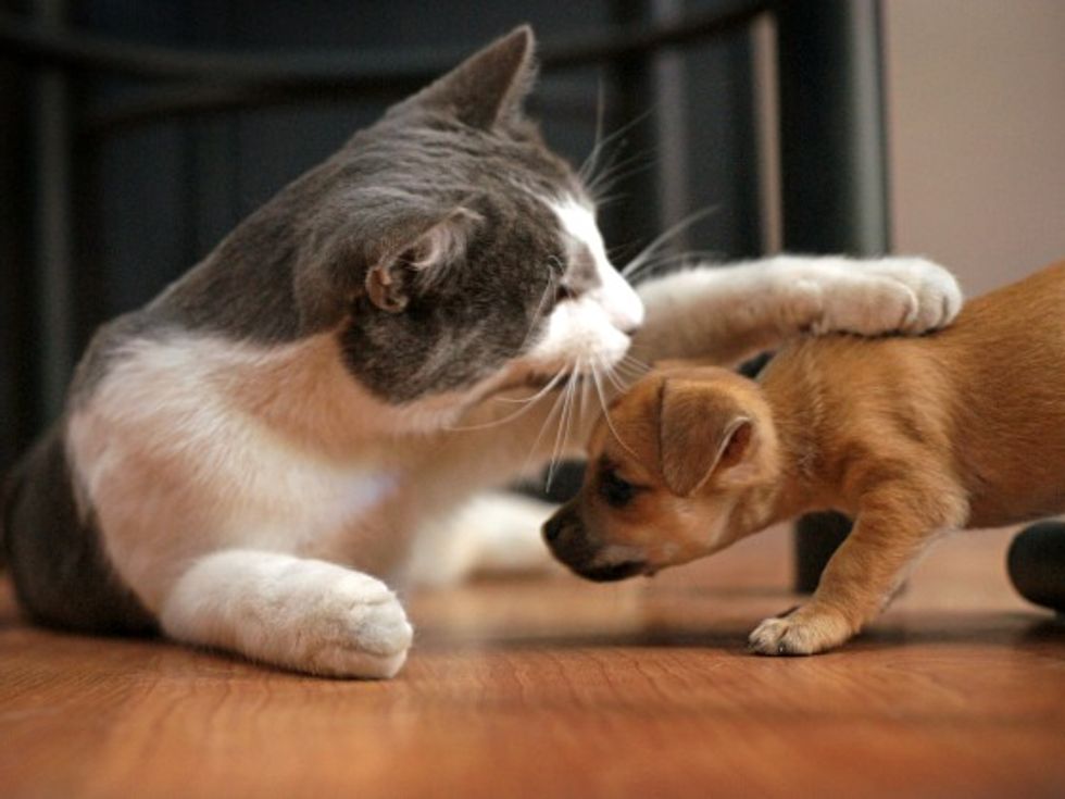 Puddy the cat welcomes the little rescue puppy into their family. According to Michele L., this 2-lb pup and the others were found in a park, but now are in good spoiling hands and paws.