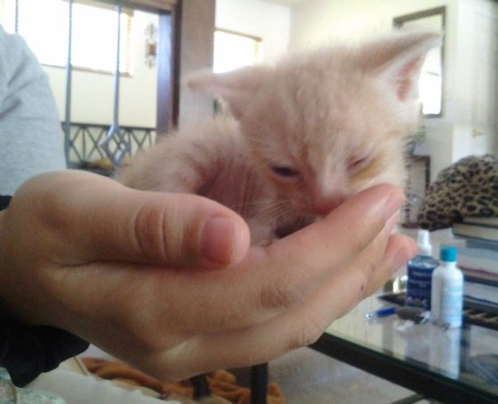 He was about 3 weeks old when we saved him, but very skinny. His eyes and nose were completely swollen and crusted shut, and he still had hundreds of cactus needles all over his body (even in his tongue/gums!). The Vet removed what they could, but they were tiny needles that blended in with his fur. I spent hours every morning picking more out of him. He sat patiently for it all, and even started purring. When Jack started opening his eyes, we were pretty sure he'd be completely blind. He was also very weak and malnourished. The veterinarians who saw him all said "You might lose him at any moment."