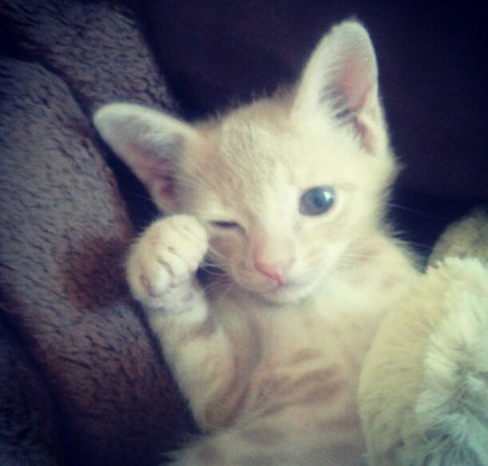 Luckily, with some love and care (and lots of medicine).. Jack regained his strength and most of his vision. Jack is basically a normal kitten now. Aside from being skinnier than other kittens and having a bit of visible eye damage in his left eye, you could never tell he spent the first 3 weeks of his life being tortured by cacti. Jack is now 7 weeks old. He loves to cuddle and play with my other cats. He cries if I leave the room for more than a few minutes, and he sleeps curled up with me.