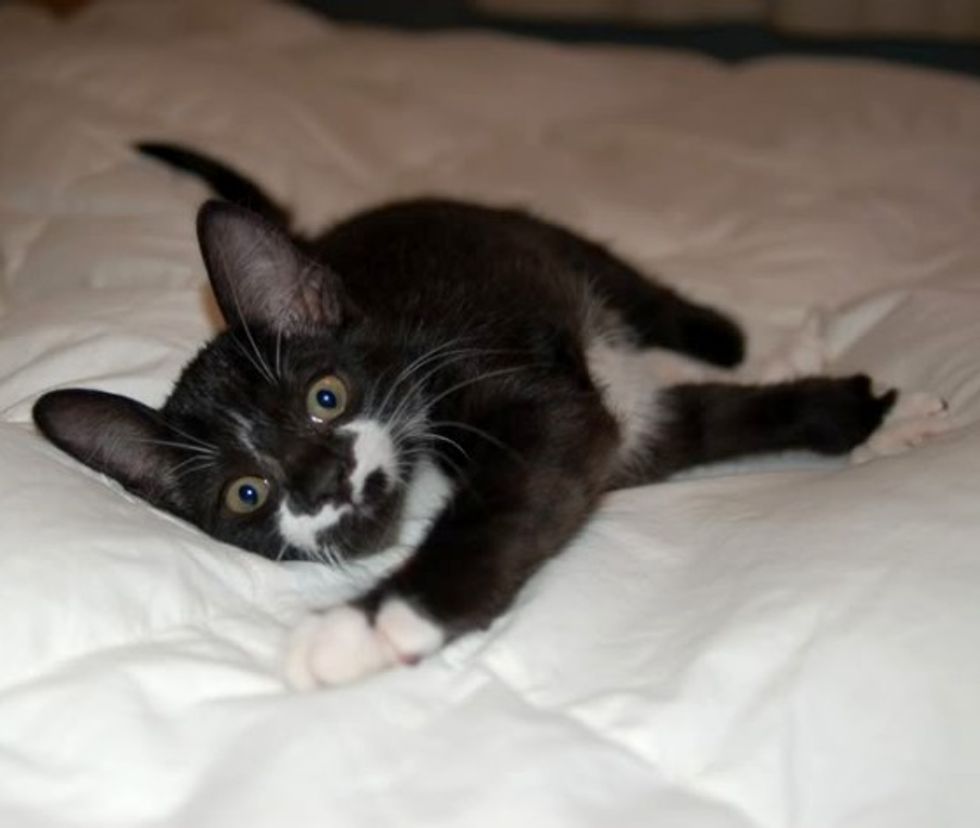 Rufio is a little tuxedo rescue with a bat-stache on his face. The little guy came from a feral cat mama that didn't survive the dangerous outdoors. Luckily he and his siblings were given a second chance. "His feral mom disappeared when he was only about five weeks old, leaving him and his litter mates beneath a porch high in the Colorado Rockies," said Kaelizilla who adopted Rufio from a woman that saved the kitties.