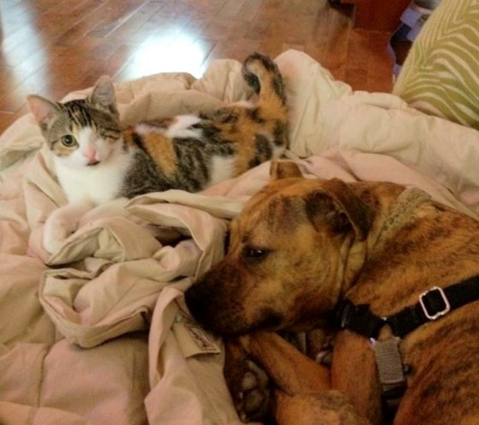 Today Elle is happily living with her new friend Zooey the dog. "[She] is having a great time in her forever home! Her mom says she plays with her kitty siblings non-stop," City Kitties reported.